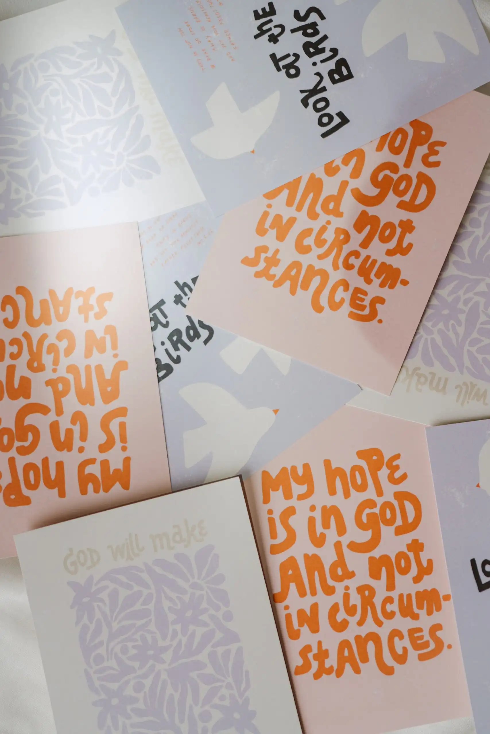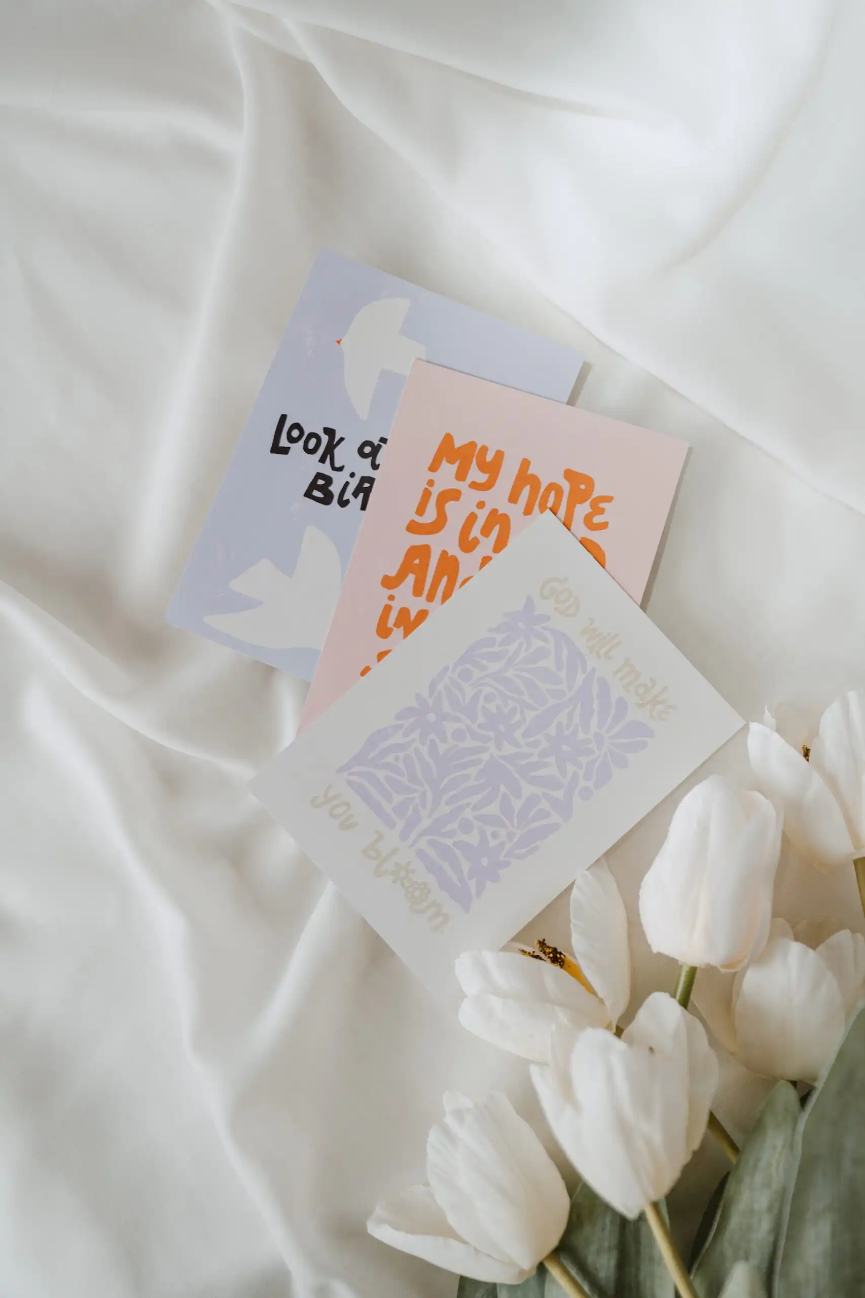 Dieses liebevoll gestaltete Set aus 3 christlichen Postkarten soll daran erinnern, dass Hoffnung, Vertrauen und Gottes Fürsorge immer da sind.