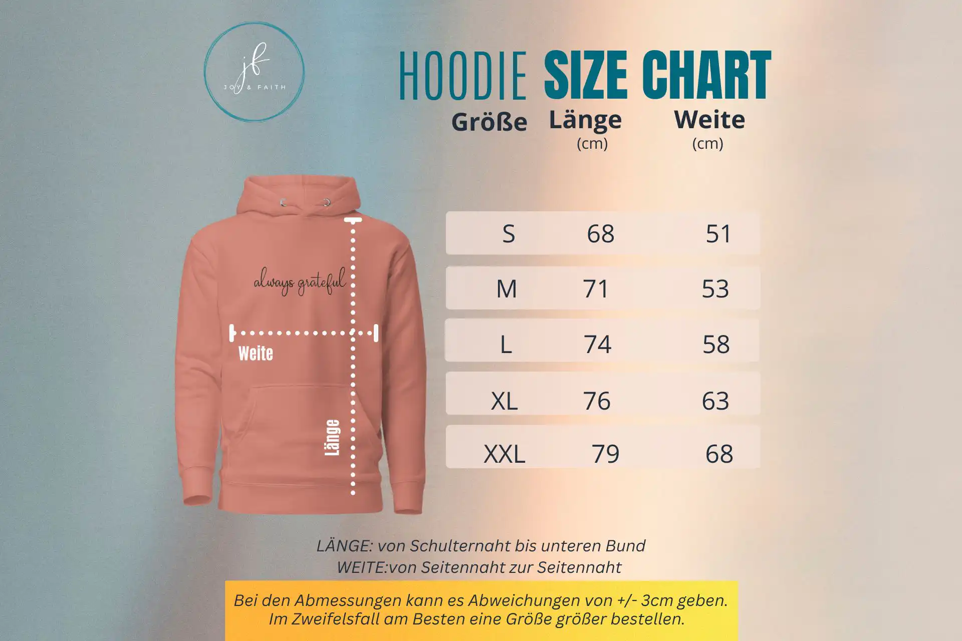 Bitte wirf einen Blick in die Größentabelle und miss im Zweifel nach, damit dein Hoodie perfekt sitzt.