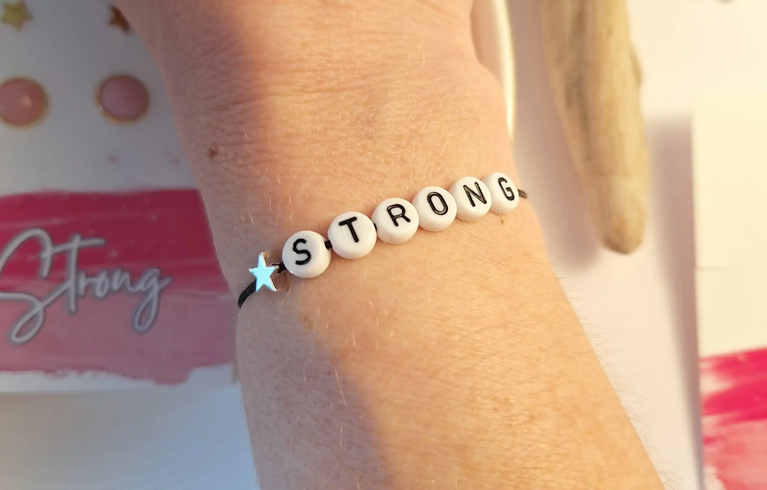 Die Stern-Ohrringe stehen für Hoffnung und Orientierung – wie ein Licht auf dem Weg. Das elastische Armband mit STRONG-Buchstaben ist nicht nur Schmuck, sondern ein täglicher Reminder für innere Stärke und Vertrauen.