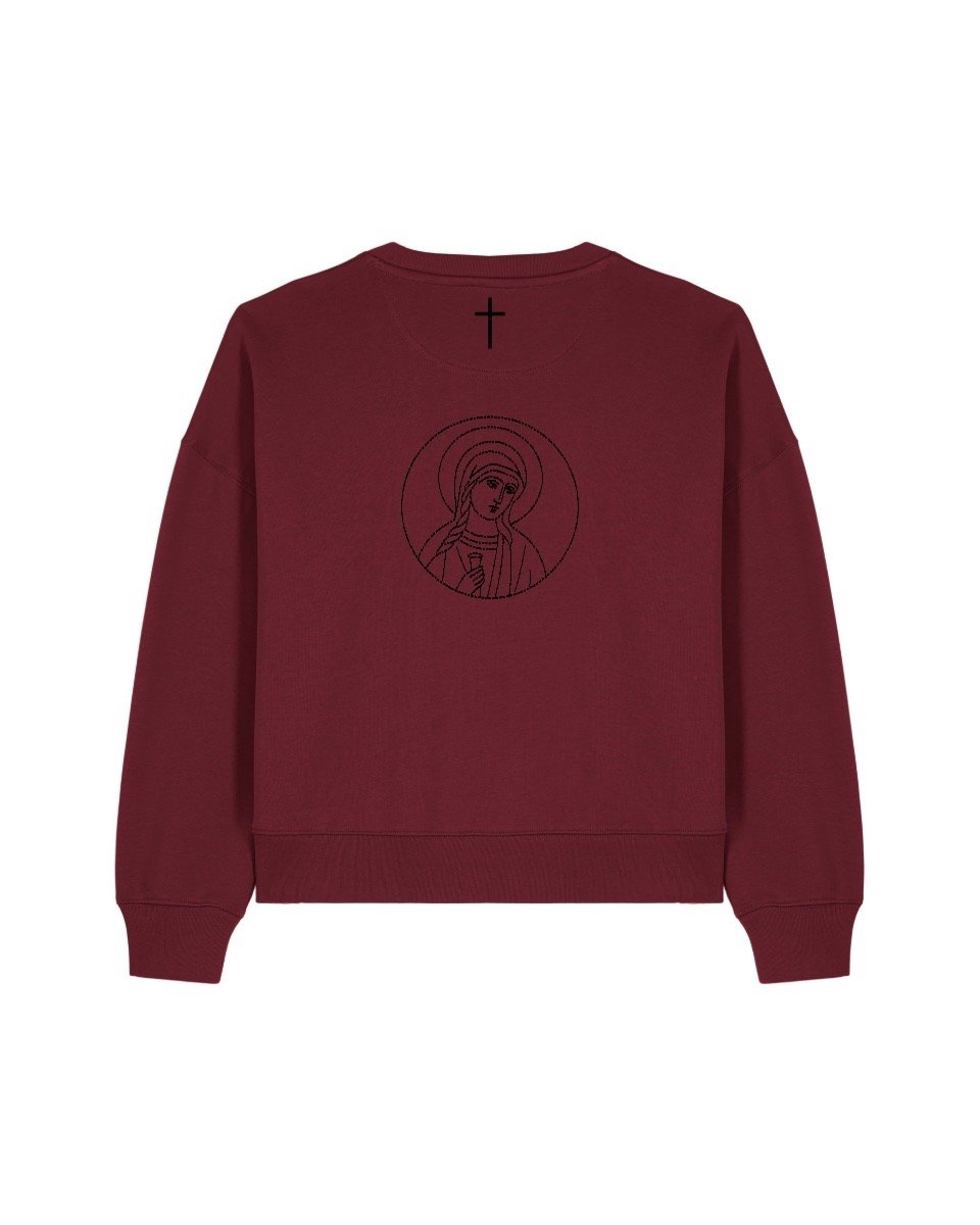 Das ICON Cropped Sweatshirt “Magdalena” zeigt die Ikone der Heiligen Maria Magdalena – die Frau, die als erste Jesus nach seiner Auferstehung sah und die Frohe Botschaft verkündete.