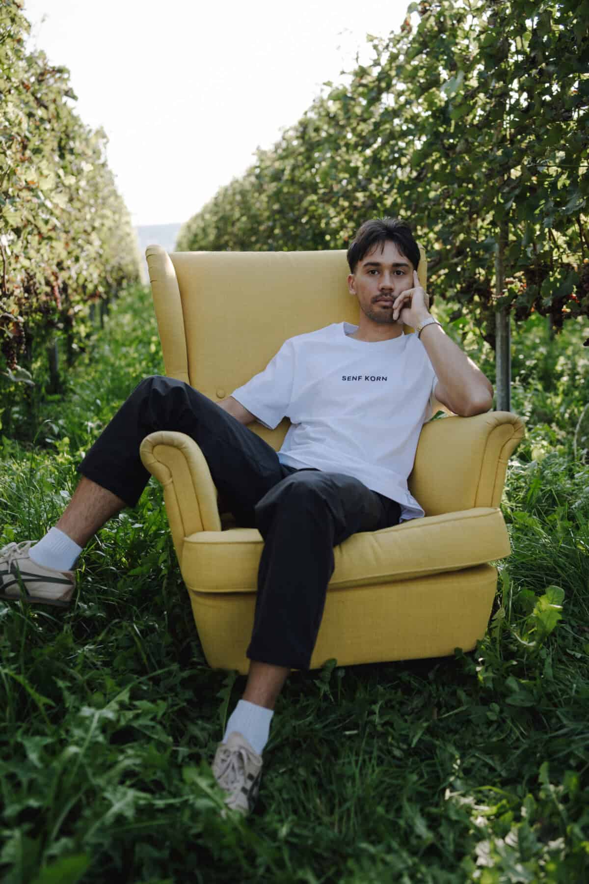 Bequemer Sessel mit christlichem Motiv, entspannter Frau, nachhaltige christliche Mode.