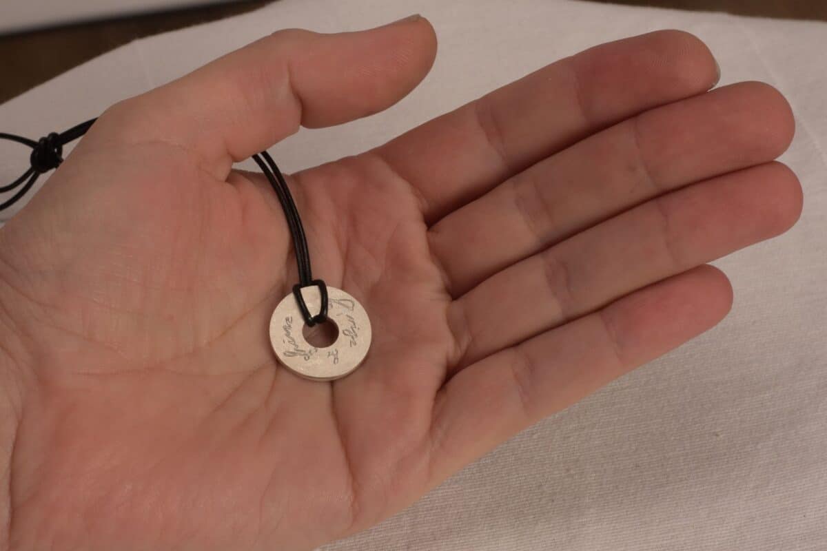 Er hat einen Durchmesser von 20 mm und ist aus recyceltem Silber gefertigt.