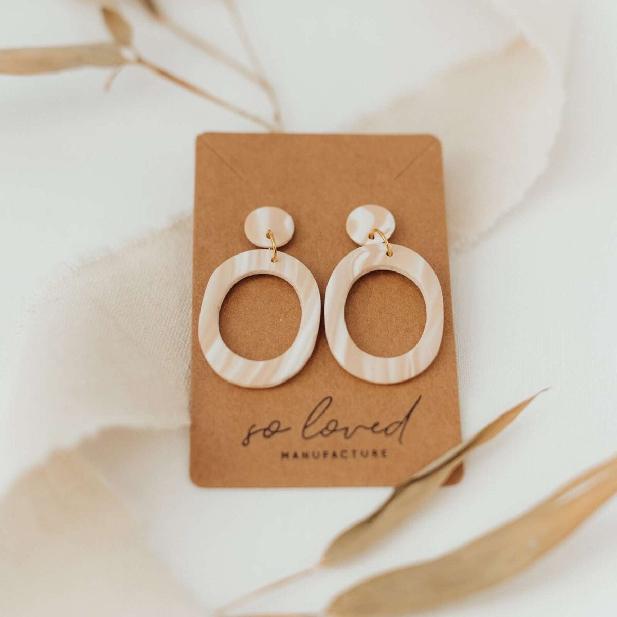 “Oval (with cutout)” transportiert Leichtigkeit und ist dennoch ein unschlagbarer Hingucker. Die Kombination aus Stabilität, Festigkeit, geringem Gewicht und großer Farbvielfalt macht das Polymer zu dem perfekten Material für Ohrringe. Die schlichte und zugleich edle Marmorierung gibt es in den Farben beige/weiß.