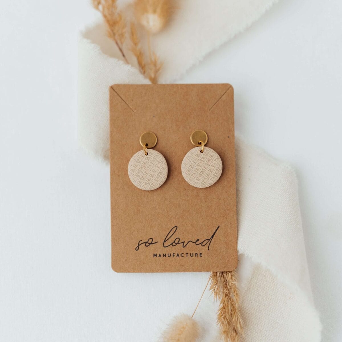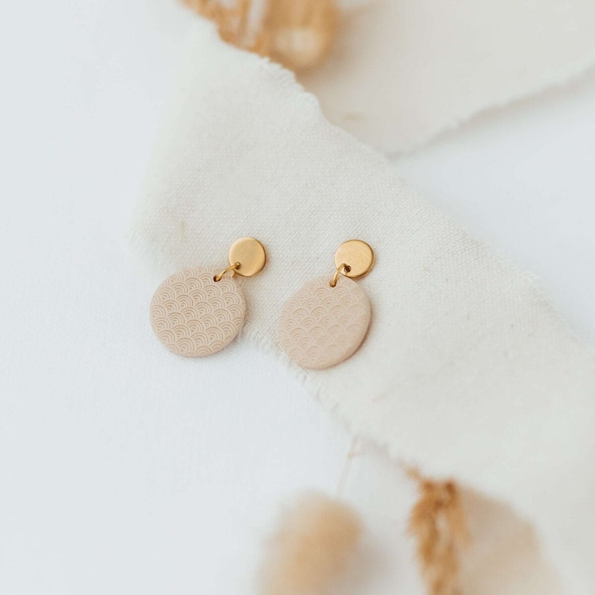“Pure Moon” ist ein kreisrunder Anhänger aus der Pure-Collection. Der liebevoll entworfene Schmuck hat ein eingearbeitetes Muster und ist in der Farbe beige erhältlich. Polymer ist ein stabiles, festes und zugleich leichtes Material und somit ideal als Material für Ohrringe geeignet.