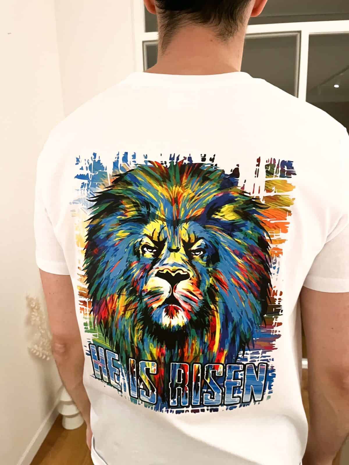 Lässiges, modebewusstes T-Shirt mit buntem Löwen inkl. Schriftzug „HE IS RISEN“ auf der Rückseite