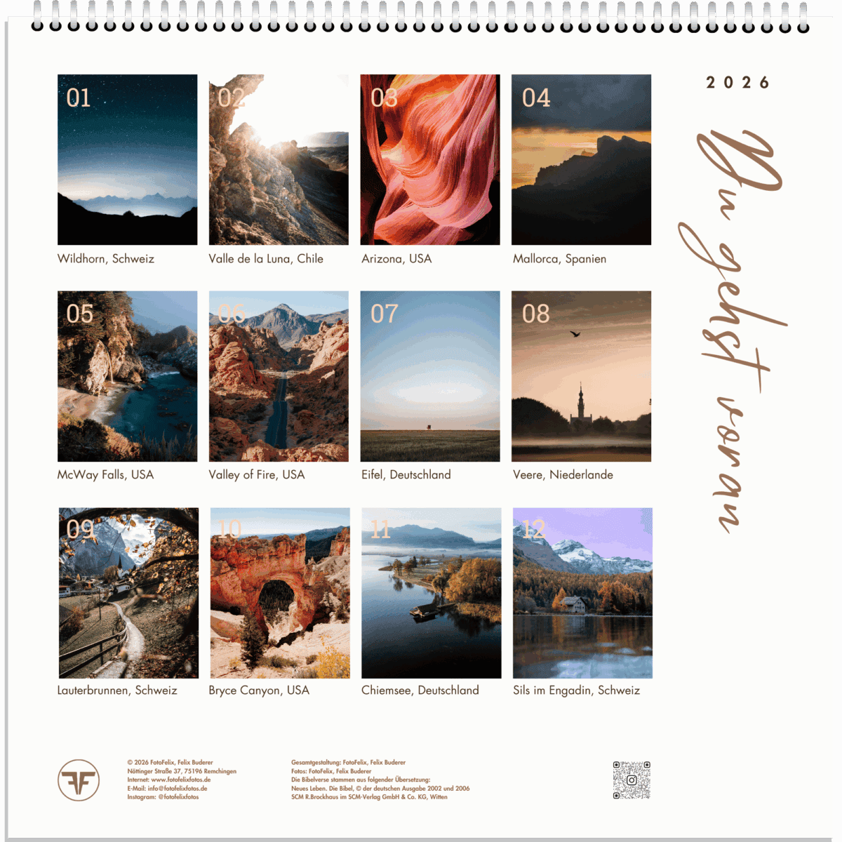 Jeden Monat erwartet dich ein stimmungsvolles Motiv: Naturaufnahmen und Drohnenperspektiven, die auf kleinem Raum große Wirkung entfalten. Dezente Monatsdaten lassen den Bildern Raum, während ein Bibelvers unter jedem Motiv dir Mut, Hoffnung und Zuversicht schenkt.