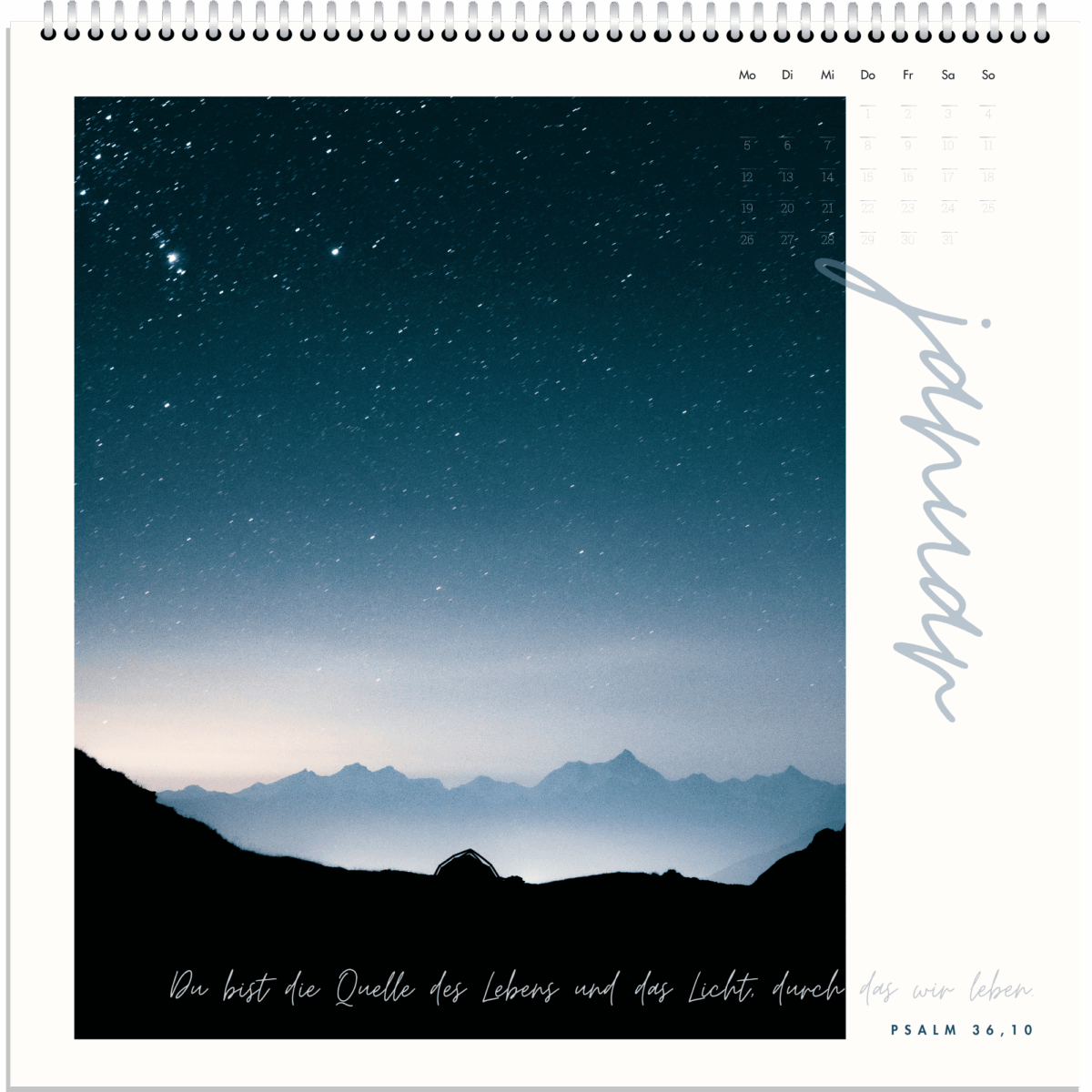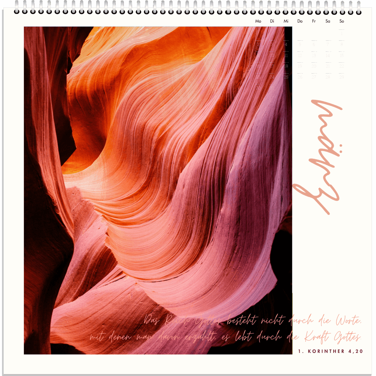 Jeden Monat erwartet dich ein stimmungsvolles Motiv: Naturaufnahmen und Drohnenperspektiven, die auf kleinem Raum große Wirkung entfalten. Dezente Monatsdaten lassen den Bildern Raum, während ein Bibelvers unter jedem Motiv dir Mut, Hoffnung und Zuversicht schenkt.