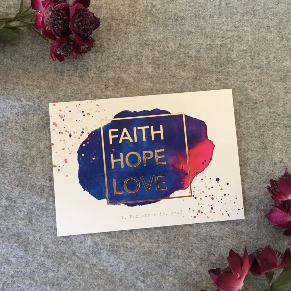 Postkarte “Faith Hope Love” als Ermutigung für einen geliebten Menschen. Hochzeitsglückwünsche für frisch vermählte Freunde. Ein Dankeschön an einen Kollegen. Oft sind es die kleinen Aufmerksamkeiten und lieben Worte, die große Freude schenken.
