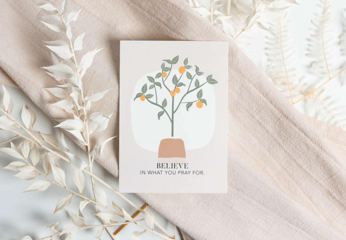 Set von 3 Karten | Liebevoll illustrierte Postkarte mit dem Spruch “Believe in what you pray for.” angelehnt an den Bibelvers Markus 11,24 im modernen Design. Eine schöne Ermutigung an sich selbst und seine Liebsten. Egal ob als Grußkarte oder zur Deko – diese Karte soll stets daran erinnern, dass unsere Gebete nicht ins leere gehen.