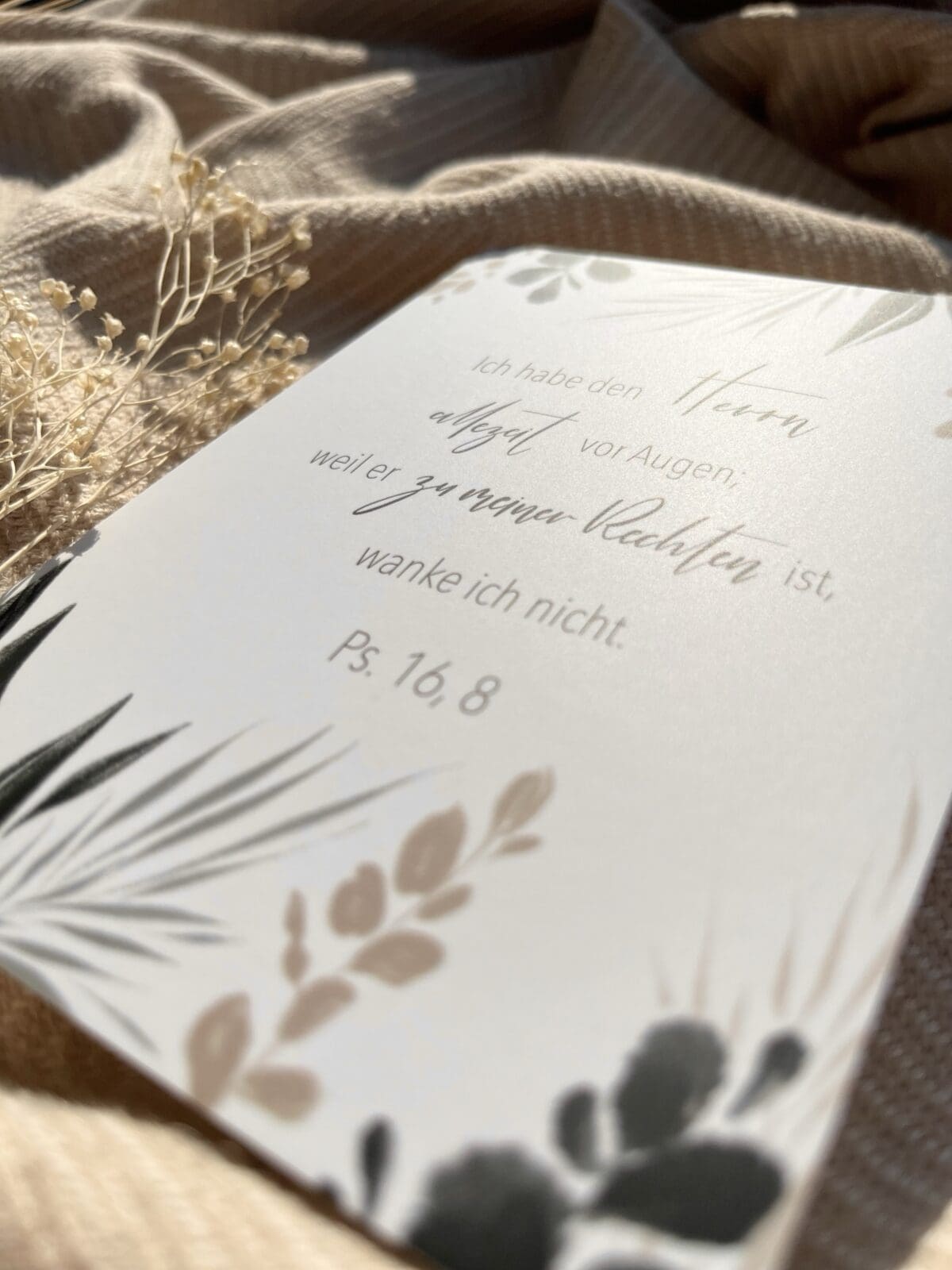 Diese Postkarte mit Bibelvers hat die Größe DIN A6 und ist beidseitig bedruckt (siehe Bilder).