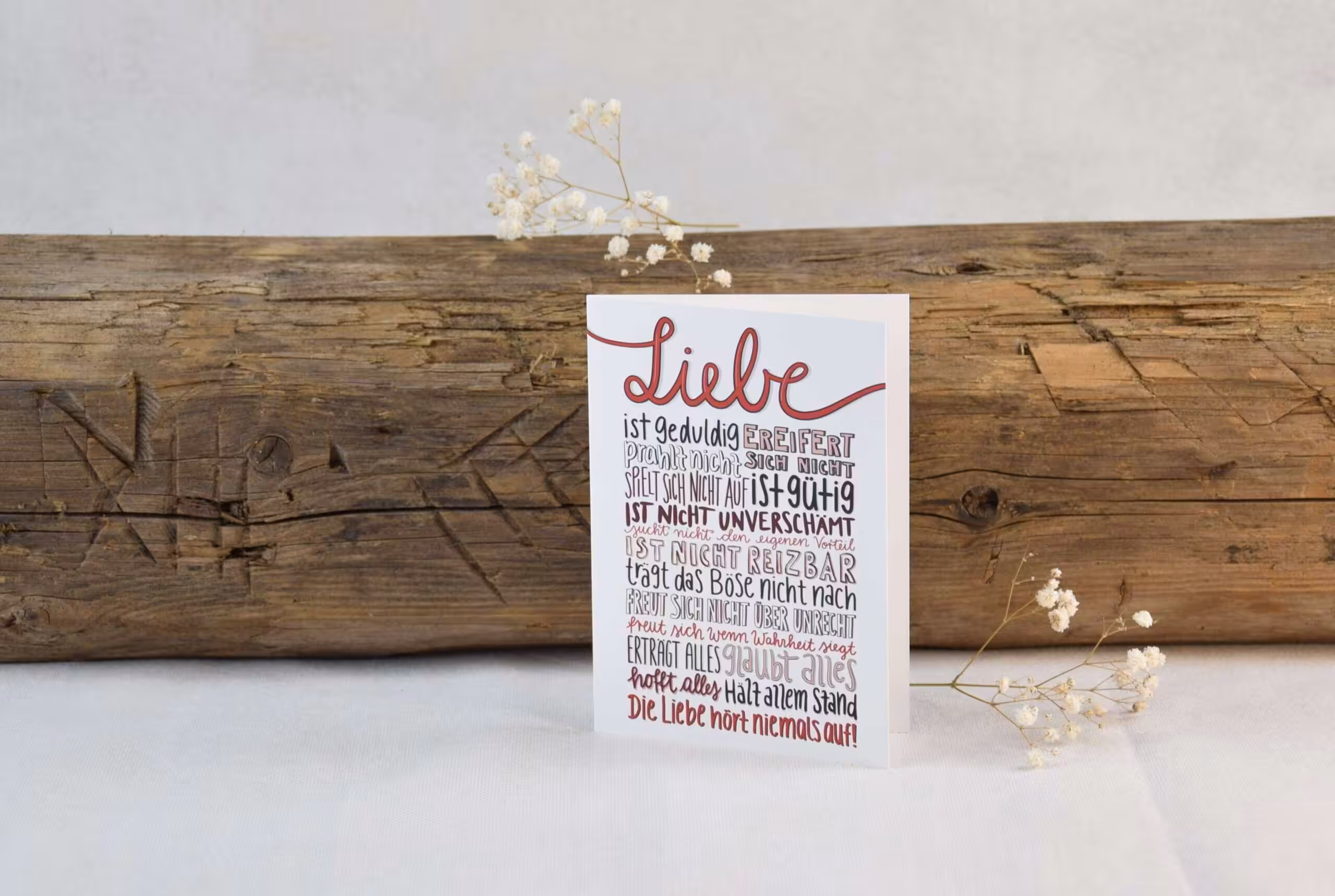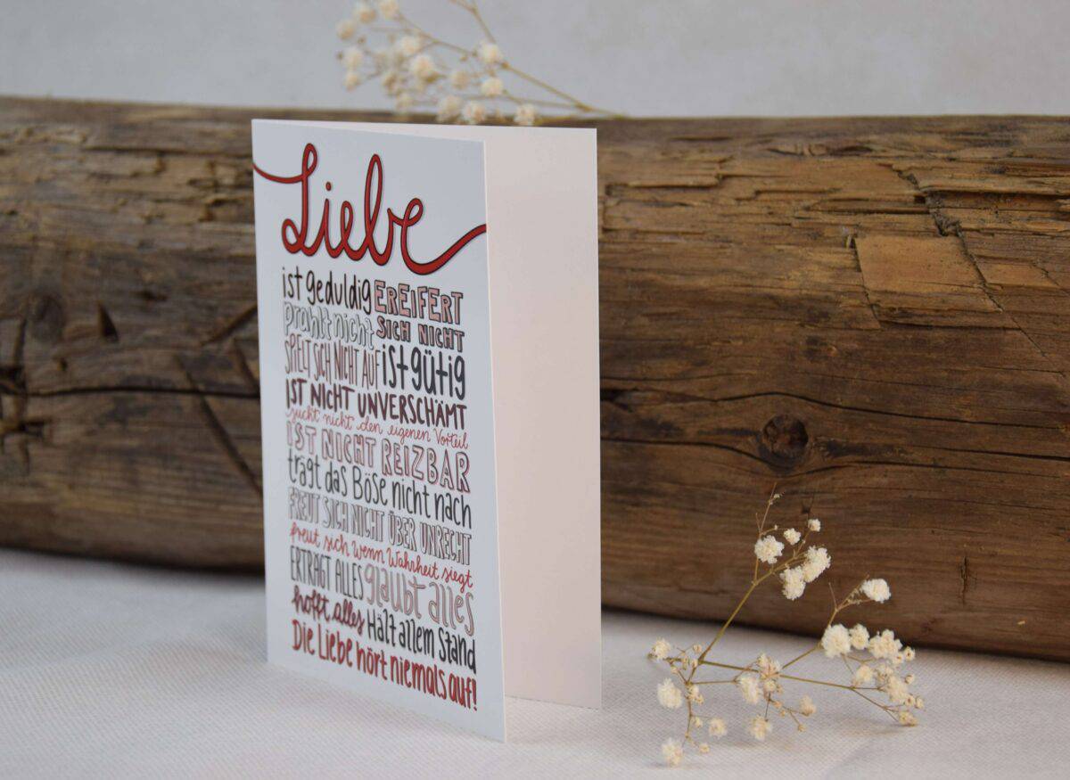 Die Glückwunschkarte “Liebe” ist passend zur Hochzeit oder zur Verlobung. Frei nach der Bibelstelle 1. Korinther 13 wurde die Karte gestaltet und zählt somit die Bestandteile der Liebe auf.