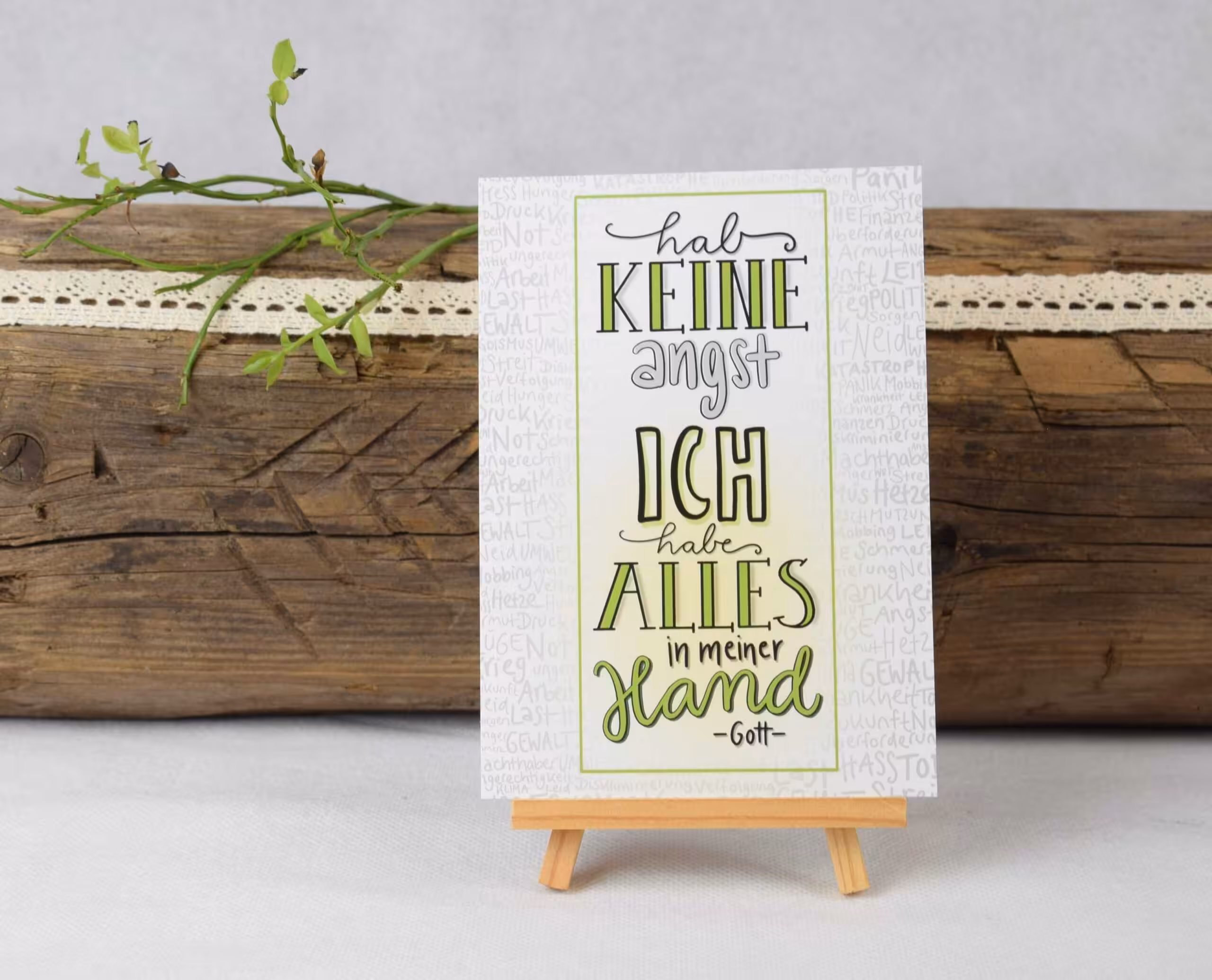 Die Karte “Keine Angst” wurde nach der Bibelstelle Jesaja 41,10 gestaltet. Die Postkarte eignet sich super zur Aufmunterung und Ermutigung sei es bei Krankheit, im Trauerfall oder einfach so zum Geburtstag.