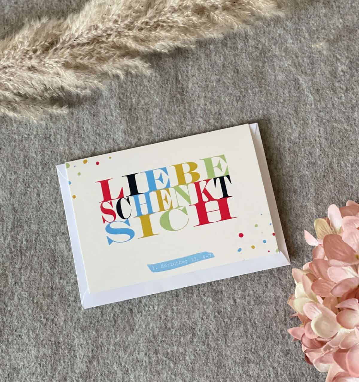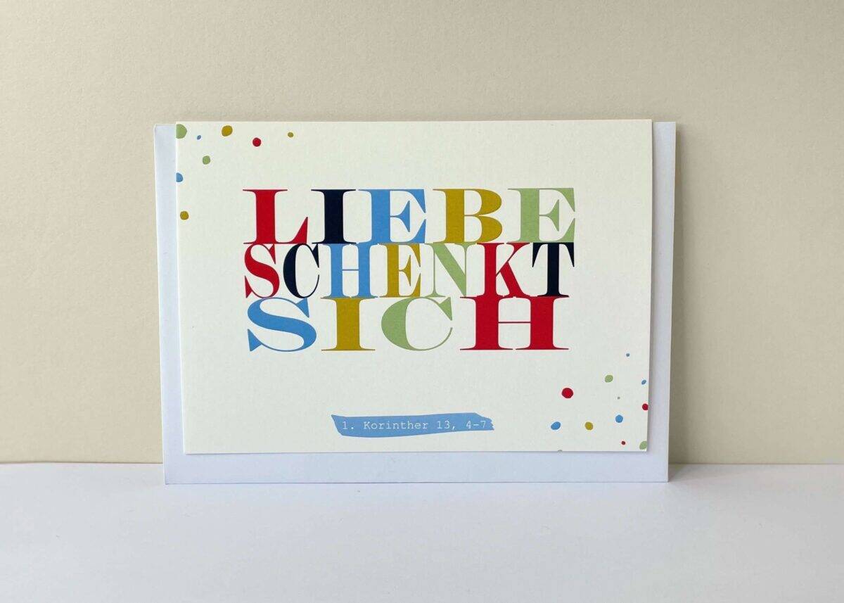 – “Liebe schenkt sich” nimmt Bezug auf die Bibelstelle 1. Korinther 13, 4-7. Die Bibelstelle ist in einem dezenten grau am unteren Rand der Karte aufgedruckt
