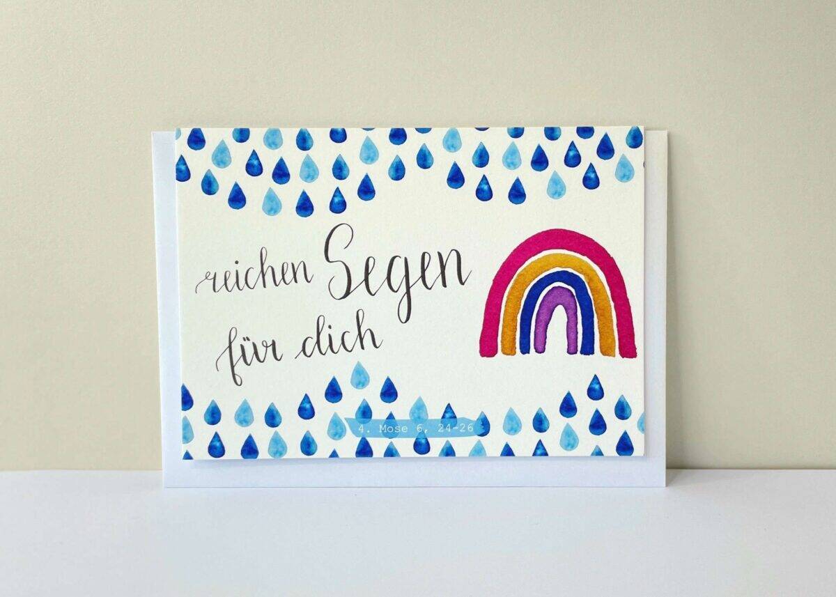 – “reichen Segen für dich” nimmt Bezug auf die Bibelstelle 4. Mose 6, 24-26. Die Bibelstelle ist in einem dezenten grau am unteren Rand der Karte aufgedruckt