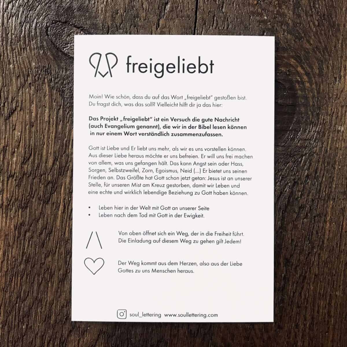 Aufgrund von vielen, vielen Nachfragen gibt es sie nun: die “freigeliebt”-Postkarte im Shop. Die evangelistische Postkarte bietet eine Erklärung zum Wort „freigeliebt“, dessen Logo sich auf der Vorderseite befindet. Die Postkarten eignen sich super zum Verschenken, als eigene kleine Erinnerung, oder als Karte zum Verteilen in Uni, Schule, etc.