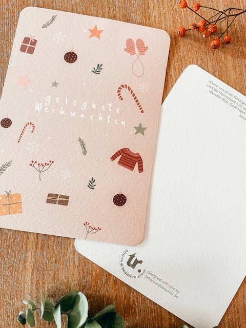 Süße Aquarellillustrationen in sanften weihnachtlichen Farben, der handgeletterte Weihnachtsgruß und der Bibelvers aus Jesaja machen diese Postkarte in A6 zu einem besonderen Geschenk.