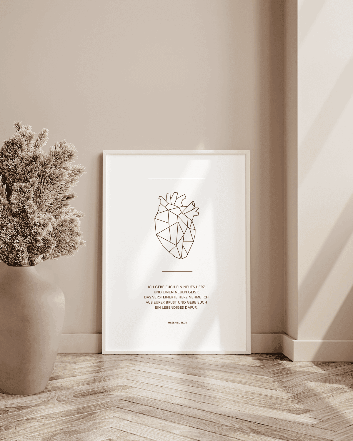 Poster mit dem Bibelvers aus Hesekiel 36,26 “Ich gebe euch ein neues Herz und einen neuen Geist: Das versteinerte Herz nehme ich aus eurer Brust und gebe euch ein lebendiges dafür.”