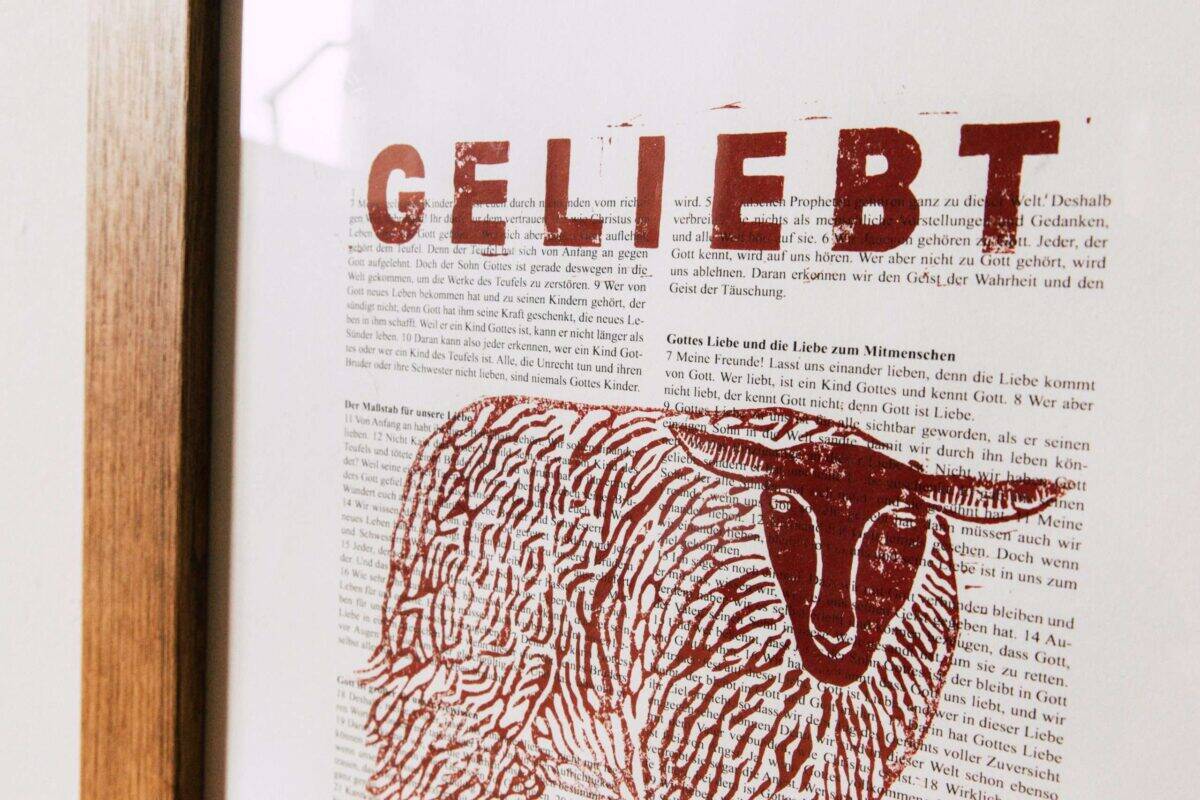das Druckmotiv «Geliebt» ist von dem folgenden Bibelvers inspiriert: wir haben erkannt, dass Gott uns liebt, und wir vertrauen fest auf diese Liebe. Gott ist Liebe, und wer in dieser Liebe bleibt, der bleibt in Gott und Gott in ihm. / 1. Johannesbrief 4.16