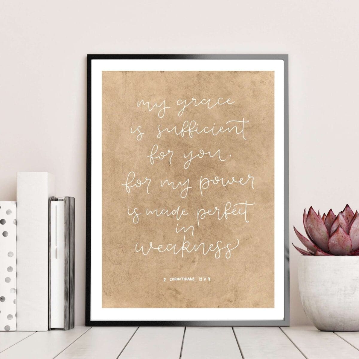 Zeitlose christliche Wanddekoration mit inspirierendem Spruch.