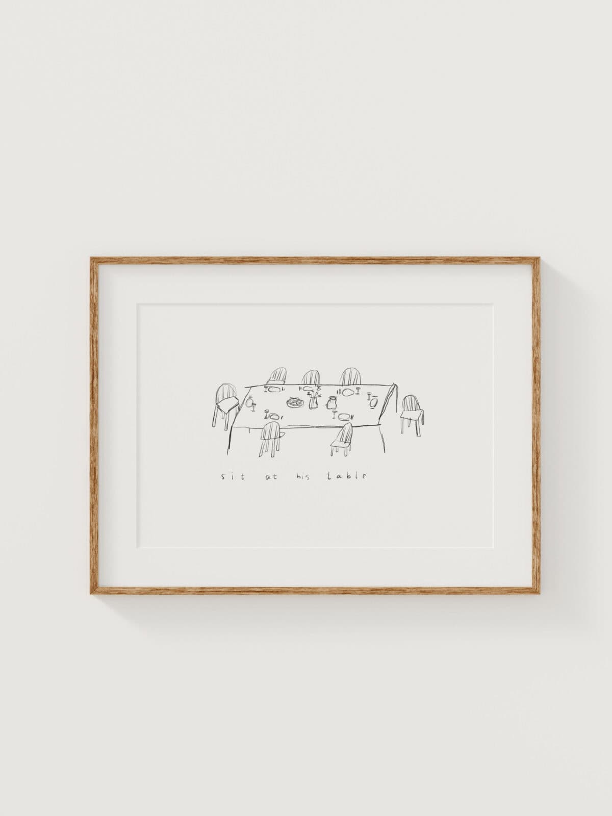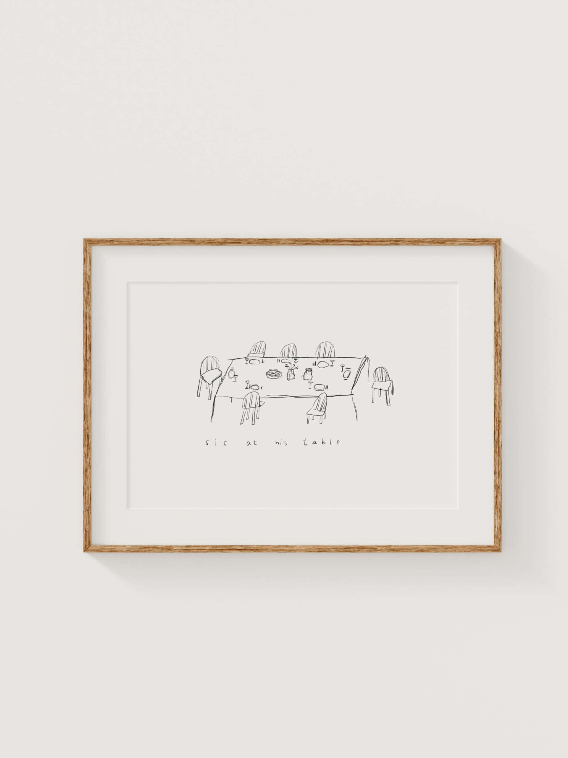Minimalistisches christliches Poster „Sit at his table“ in Schwarz-Weiß – moderne Wanddeko mit Einladung an Gottes Tisch, perfekt als Geschenk für z.B. die Küche.