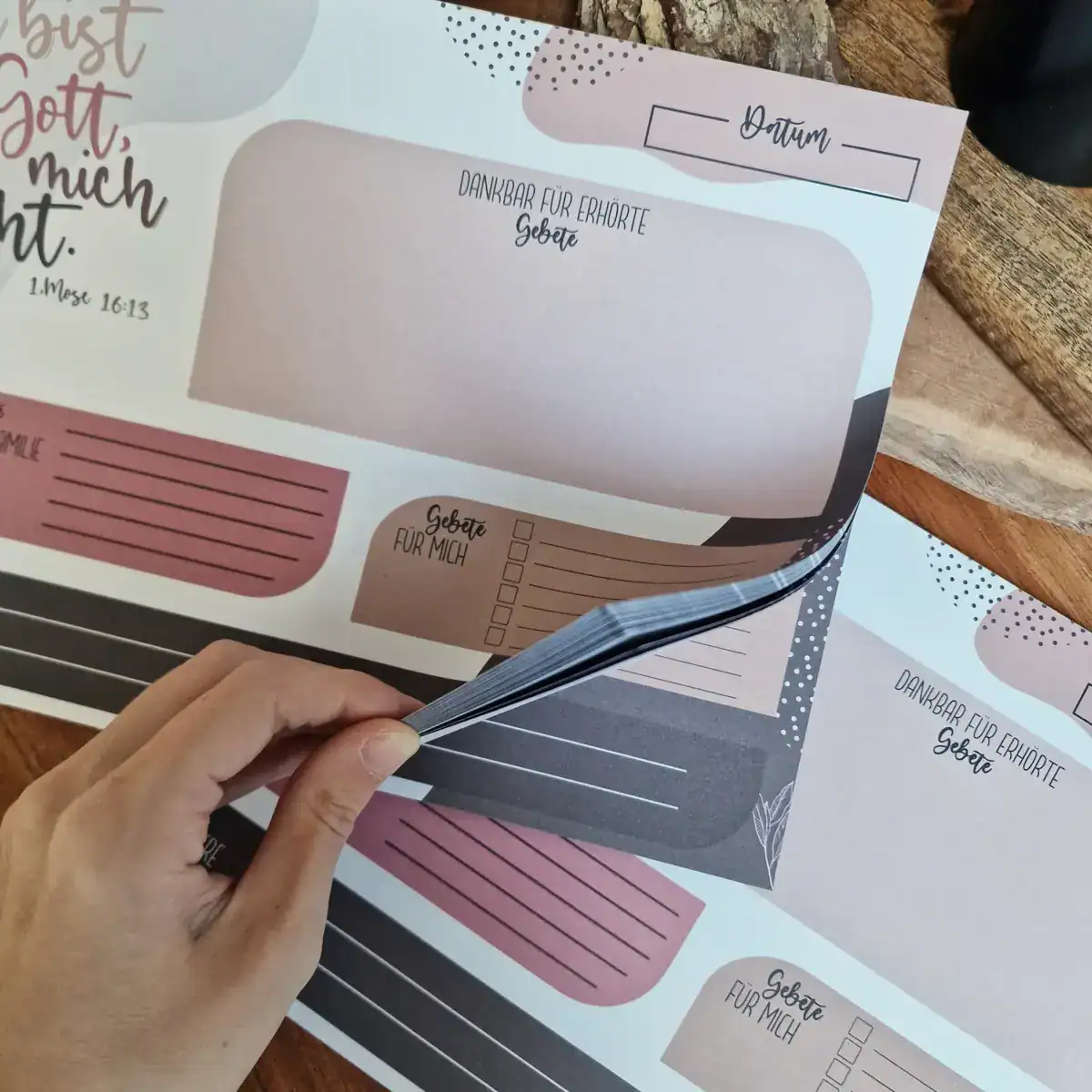 Mit viel Hingabe und Sorgfalt von uns gestaltet. Dank der hochwertigen Leimbindung und des beschreibbaren Papiers ist dieser Block nicht nur praktisch, sondern auch langlebig. Er wird zu einem treuen Begleiter auf deinem Glaubens-Weg.