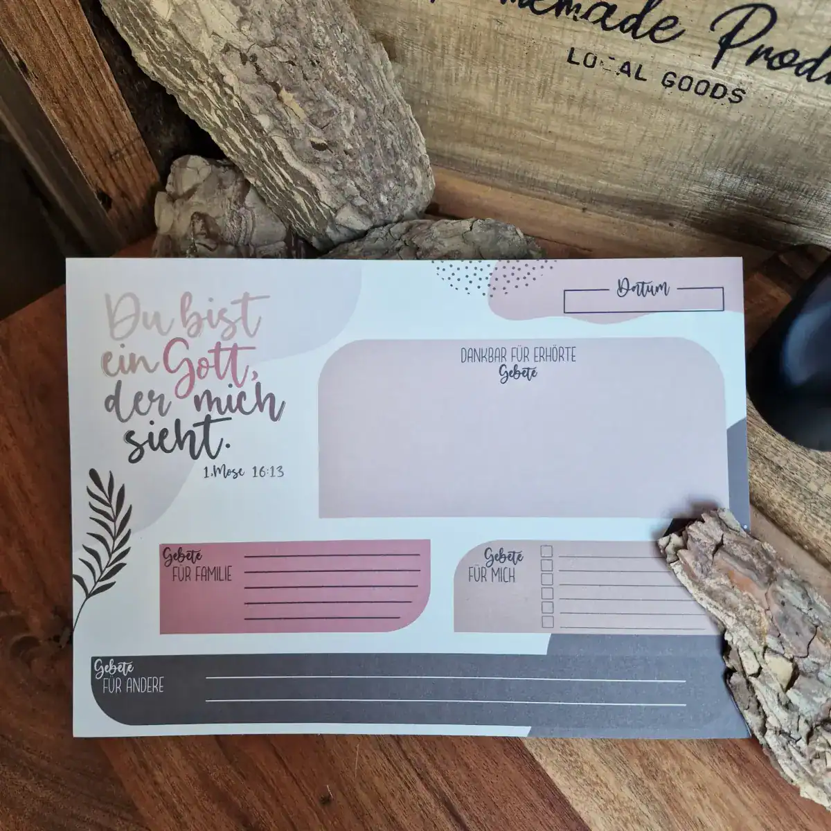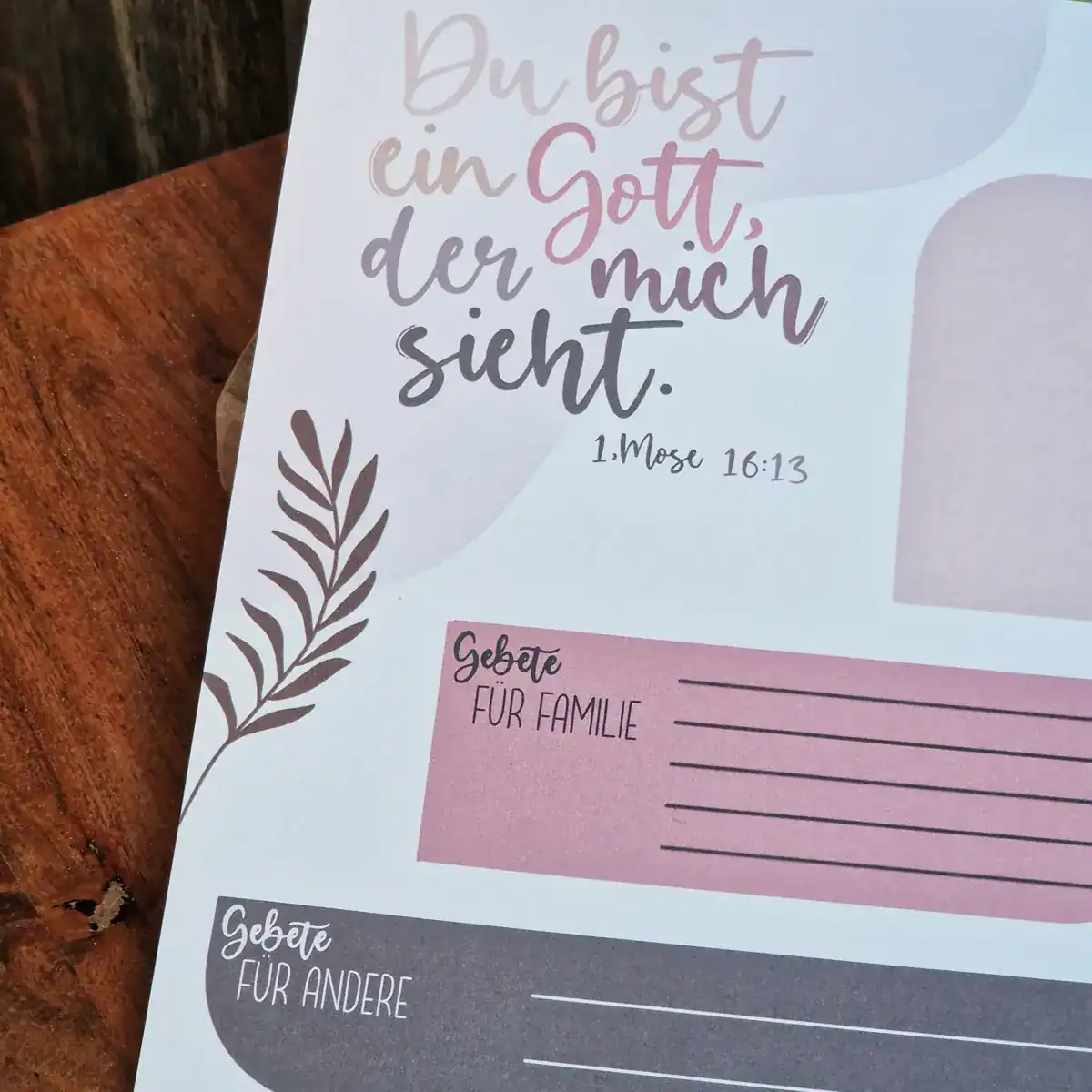 Jede Seite ist liebevoll gestaltet und enthält den Leitvers „Du bist ein Gott, der mich liebt“ aus 1. Mose 16, 13. Zusätzlich hast du genügend Platz, deine verschiedenen Gebetsanliegen zu gliedern. Ob für Dankbarkeit über erhörte Gebete, Fürbitte für Familie, dich selbst oder andere – dieser Gebetsblock unterstützt dich dabei, deine Beziehung zu Gott zu vertiefen und den Glauben im Alltag zu leben.