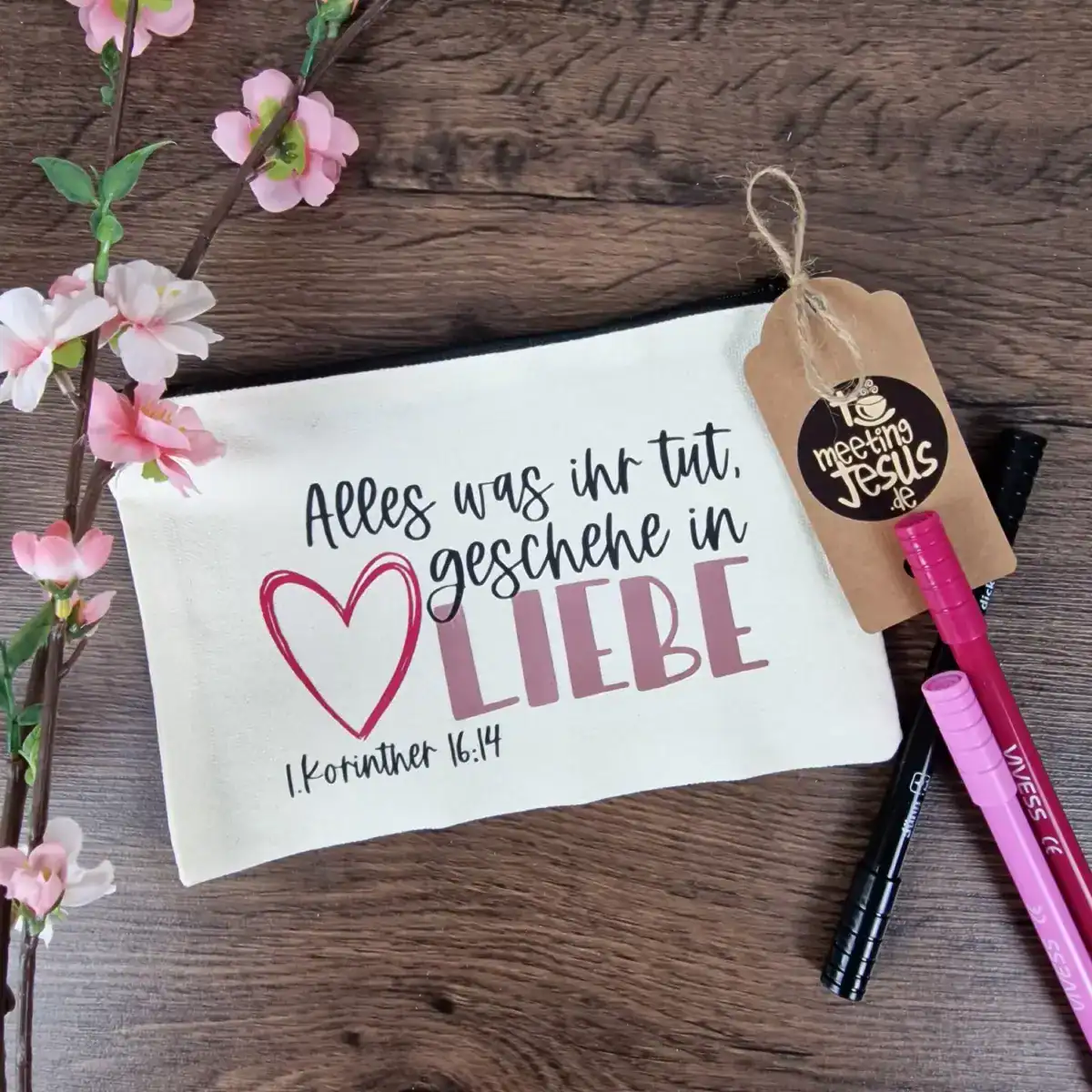 wir haben hier etwas ganz Besonderes für euch: eine Federmappe aus Stoff, auf der „Alles was ihr tut geschehe in Liebe“ steht. Dieser Spruch stammt aus 1. Korinther 16, 14 und erinnert uns daran, dass alles was wir tun, aus Liebe zu Gott und unseren Mitmenschen geschehen sollte.