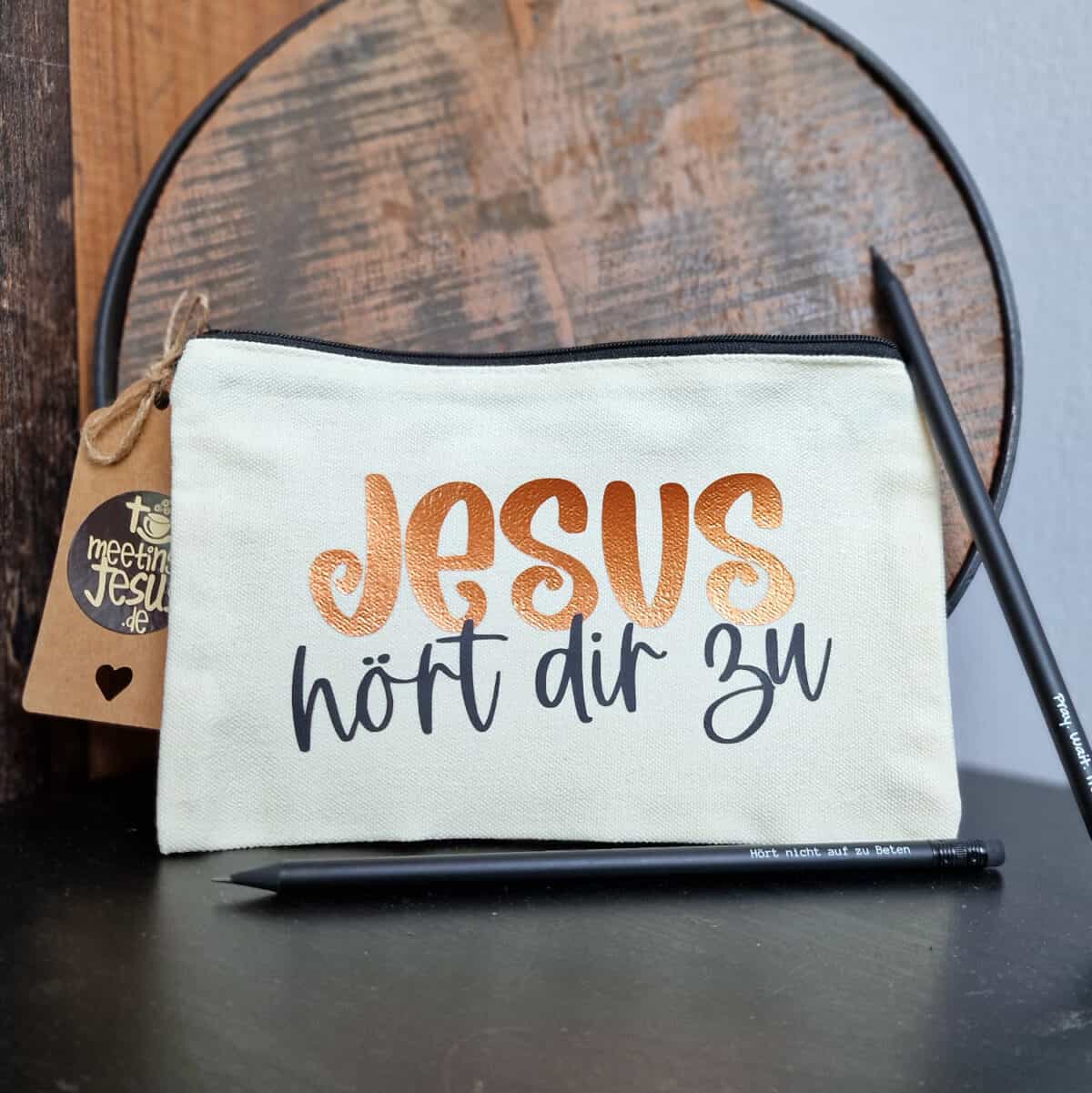 Unsere handgefertigte Federmappe mit dem inspirierenden Aufdruck “Jesus hört dir zu” ist ein besonderes Accessoire für deinen Alltag. Sie erinnert dich daran, dass du niemals allein bist und Jesus immer da ist, um dir zuzuhören und dich zu stärken.