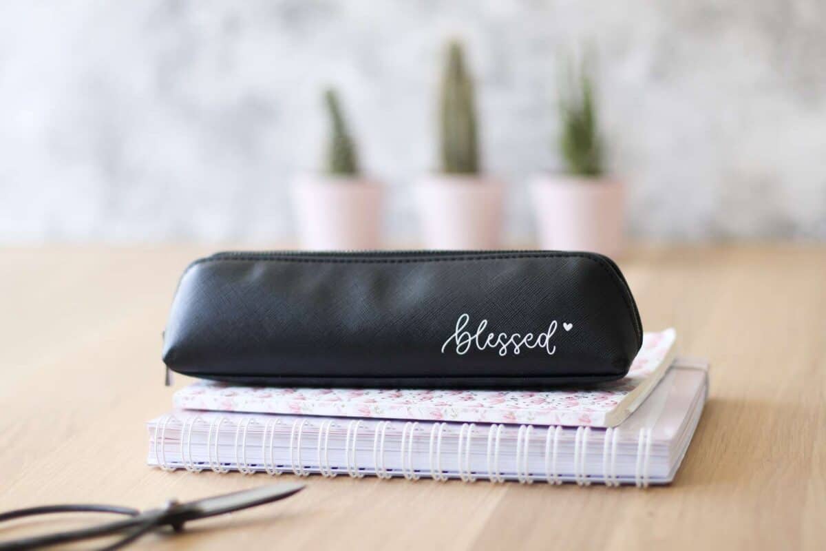 HĂĽbsches, kleines Federmäppchen oder Kosmetiktasche mit dem Aufdruck “blessed”