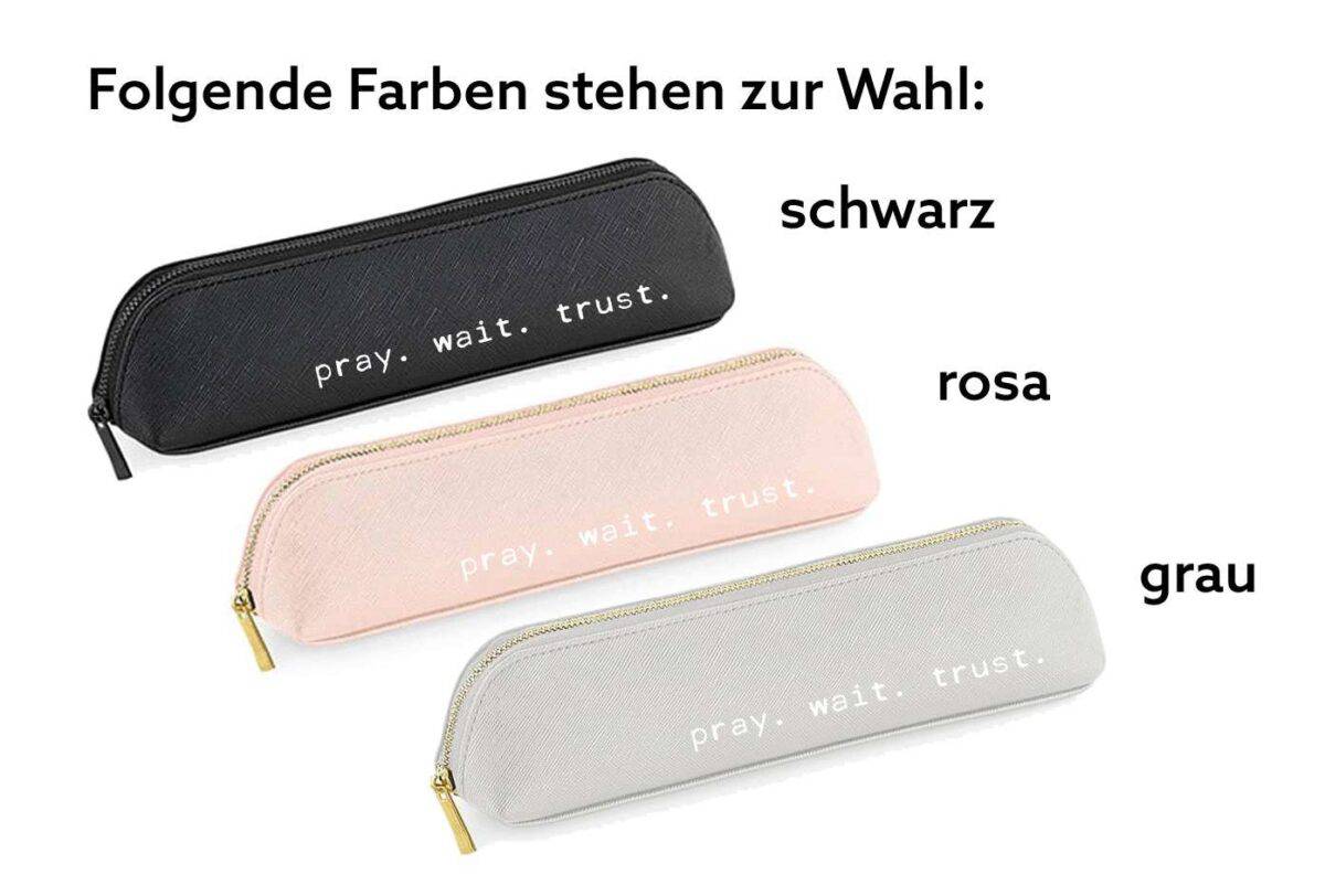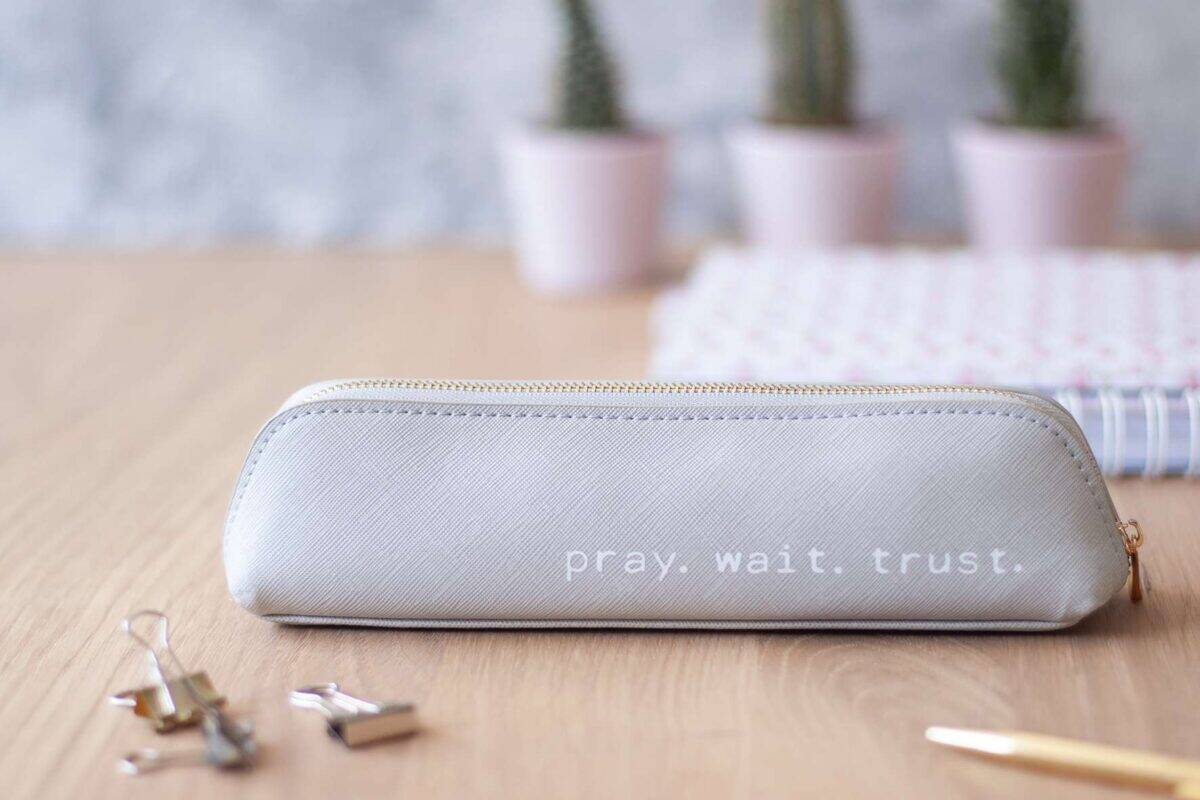 Schönes, kleines Federmäppchen oder Kosmetiktasche mit ermutigendem Spruch “pray. wait. trust.”