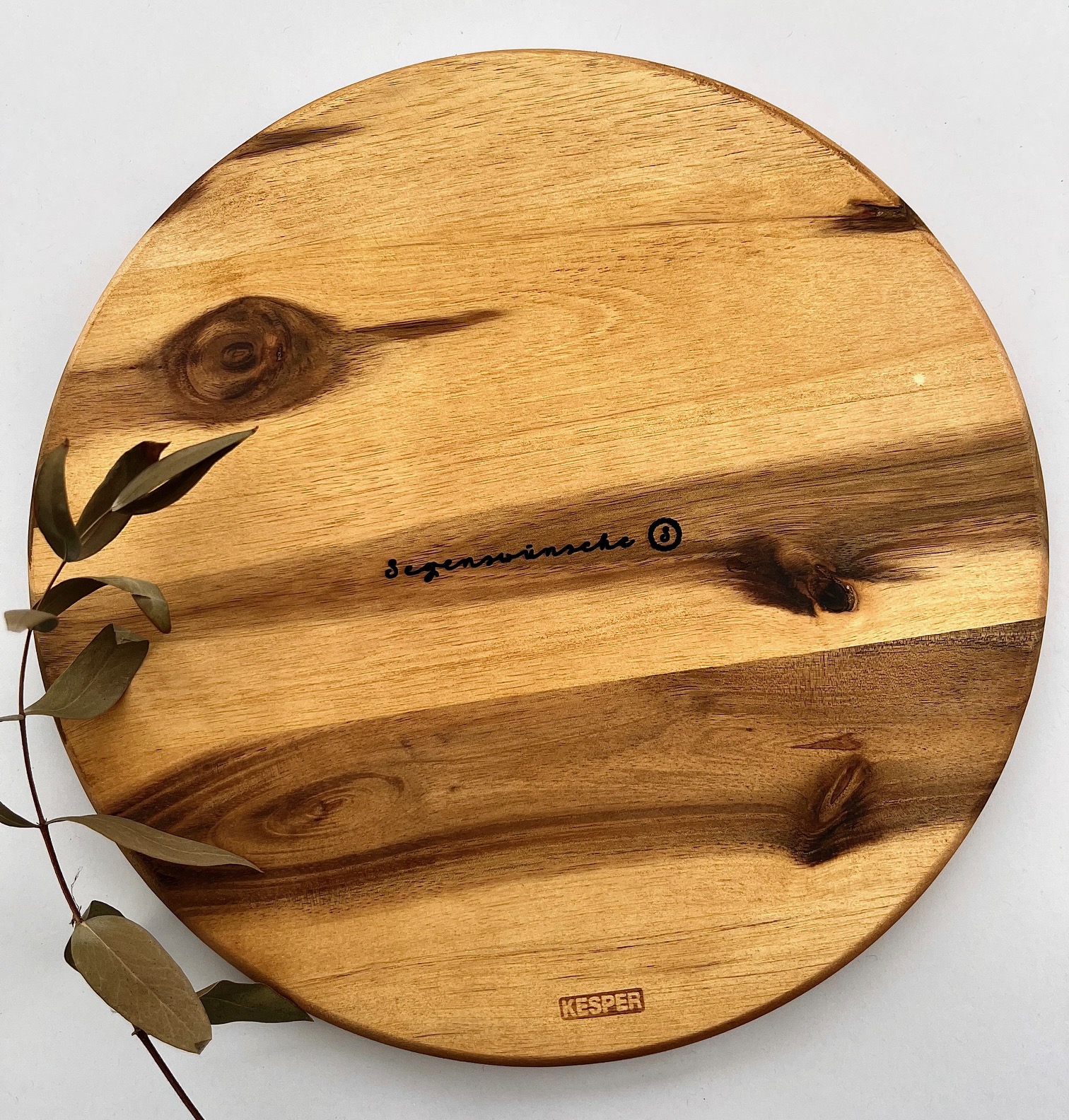 Dieses handgefertigte, runde Schneidebrett aus Holz hat einen Durchmesser von 25 cm.