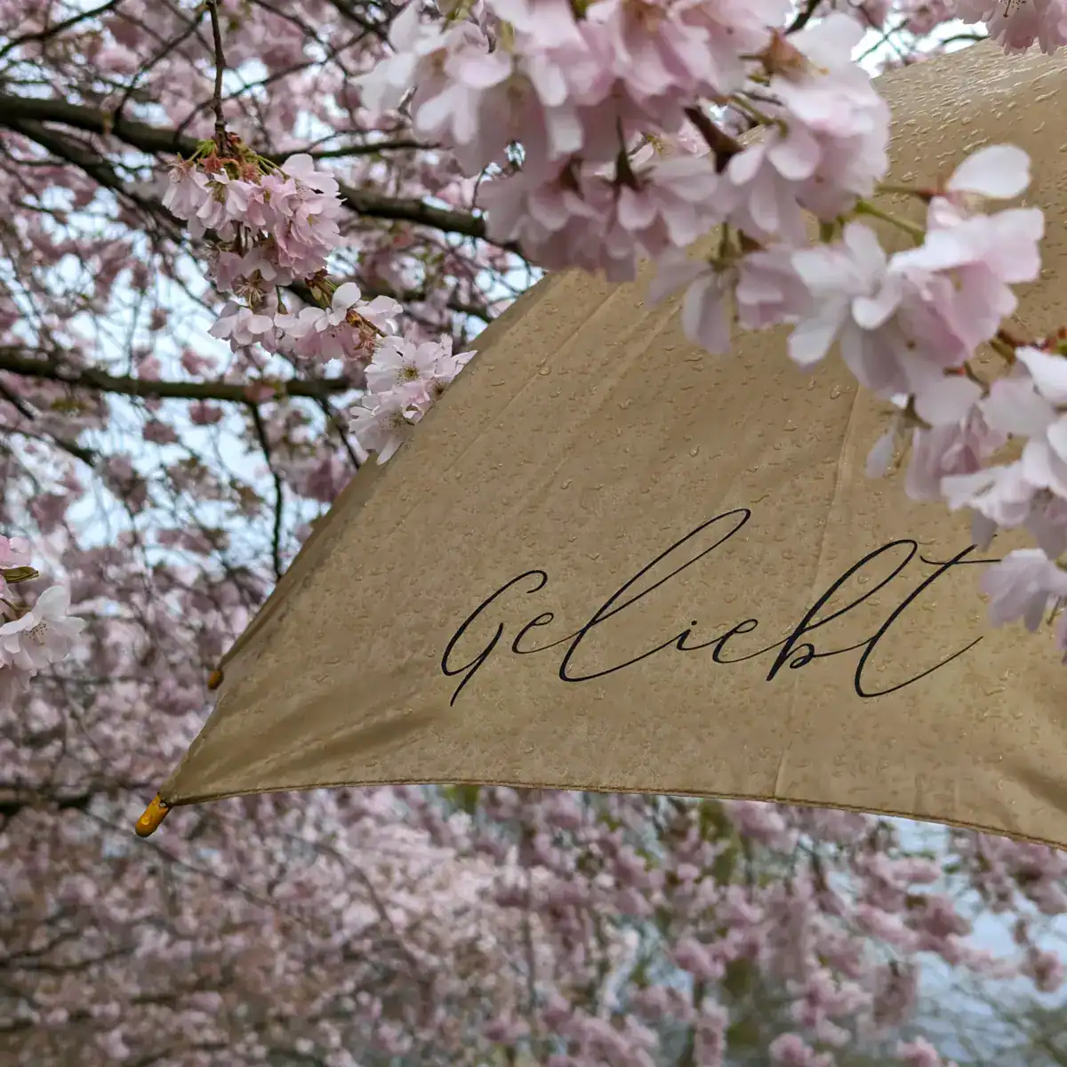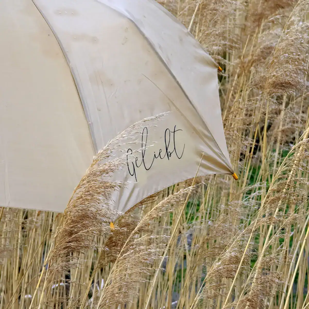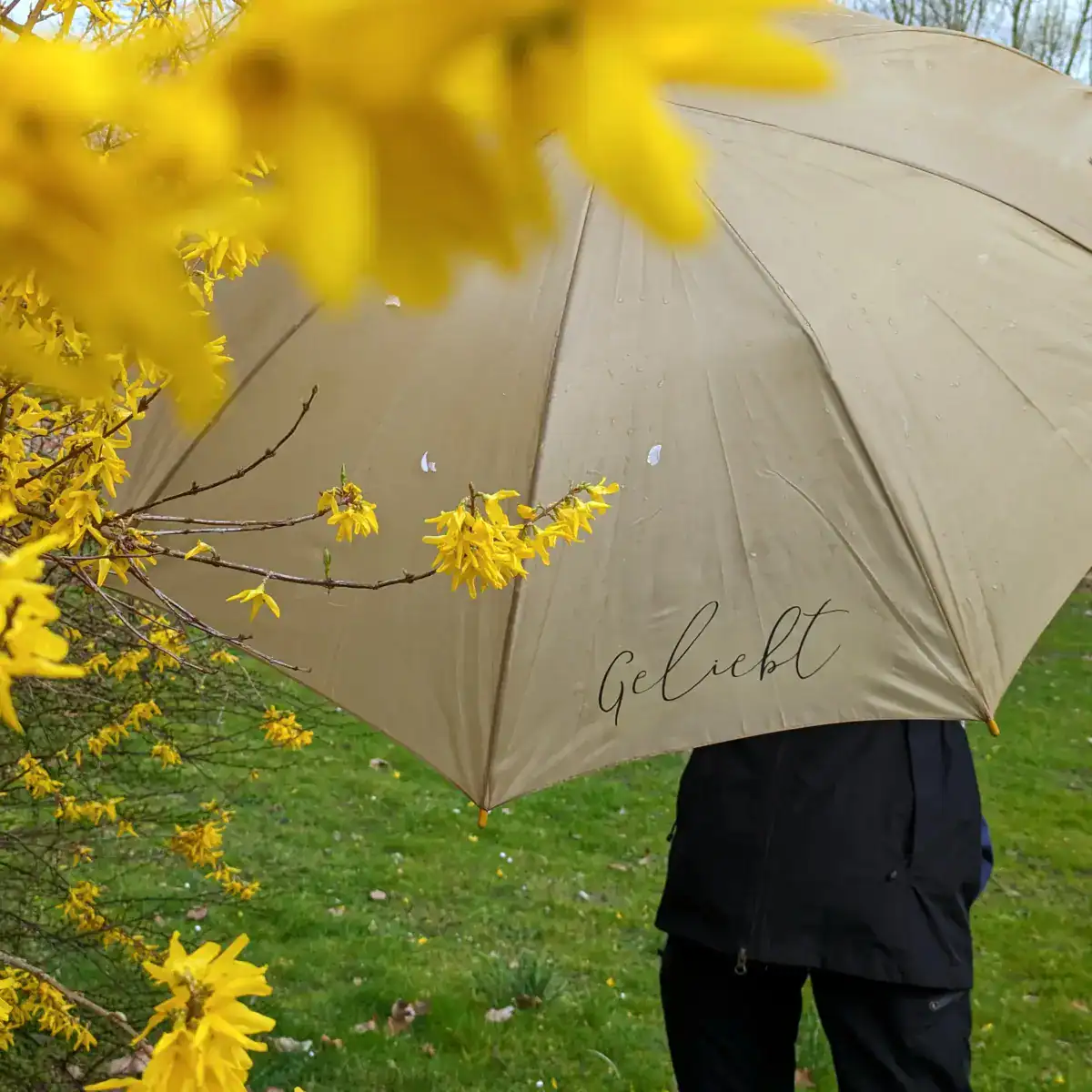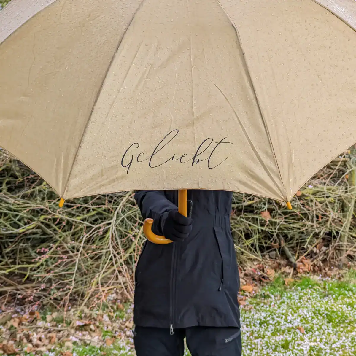 Unser „Geliebt“ Regenschirm – dein zuverlässiger Begleiter an regnerischen Tagen, besonders im Herbst, wenn die ersten kühlen Winde aufziehen und das Laub unter den Füßen raschelt. Der Schirm besticht durch seine robuste, wasserabweisende Polyester-Bespannung und die Metallspeichen mit einer Länge von 60 cm, die für Stabilität und Langlebigkeit sorgen. Der Holztipp und der Rundhakengriff verleihen dem Schirm einen edlen Touch, während das praktische Schließband mit Klettverschluss für einfache Handhabung sorgt.