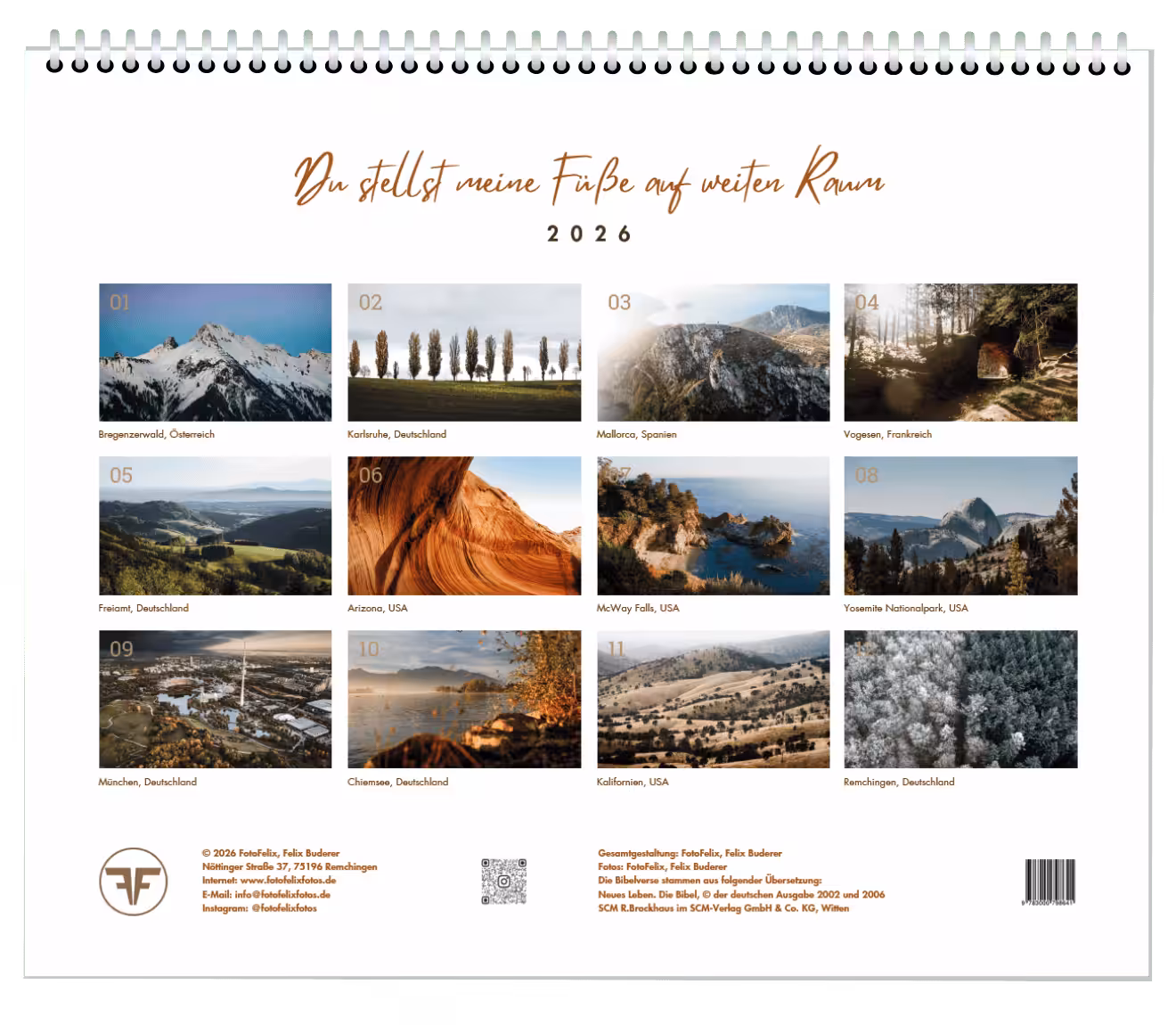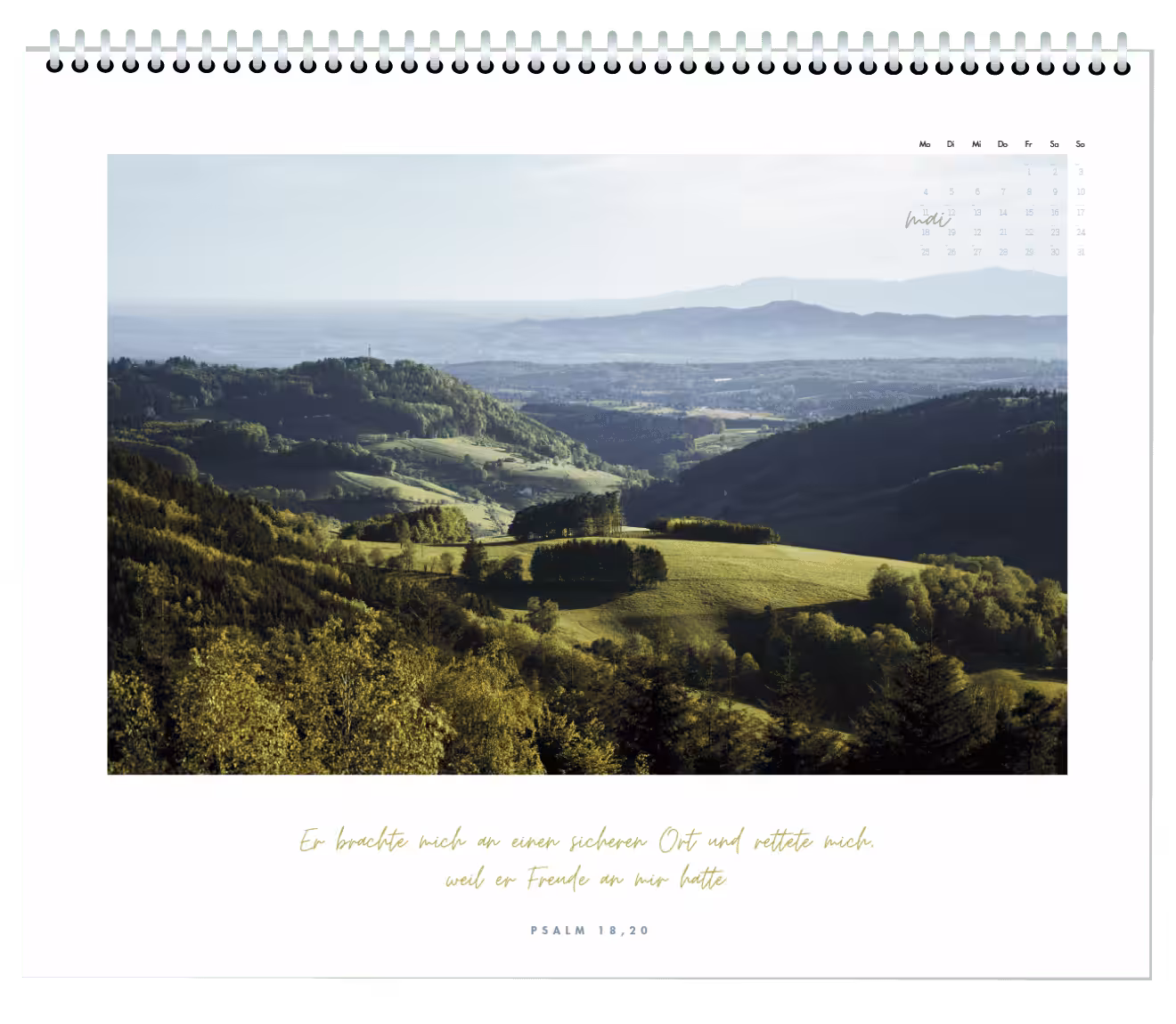 Die Monatsdaten sind dezent in einer Ecke gehalten, um die Bilder in den Mittelpunkt zu stellen. Unter jedem Motiv findest du einen Bibelvers, der Mut, Hoffnung und Inspiration schenkt – perfekt, um den Alltag mit positiven Impulsen zu bereichern.