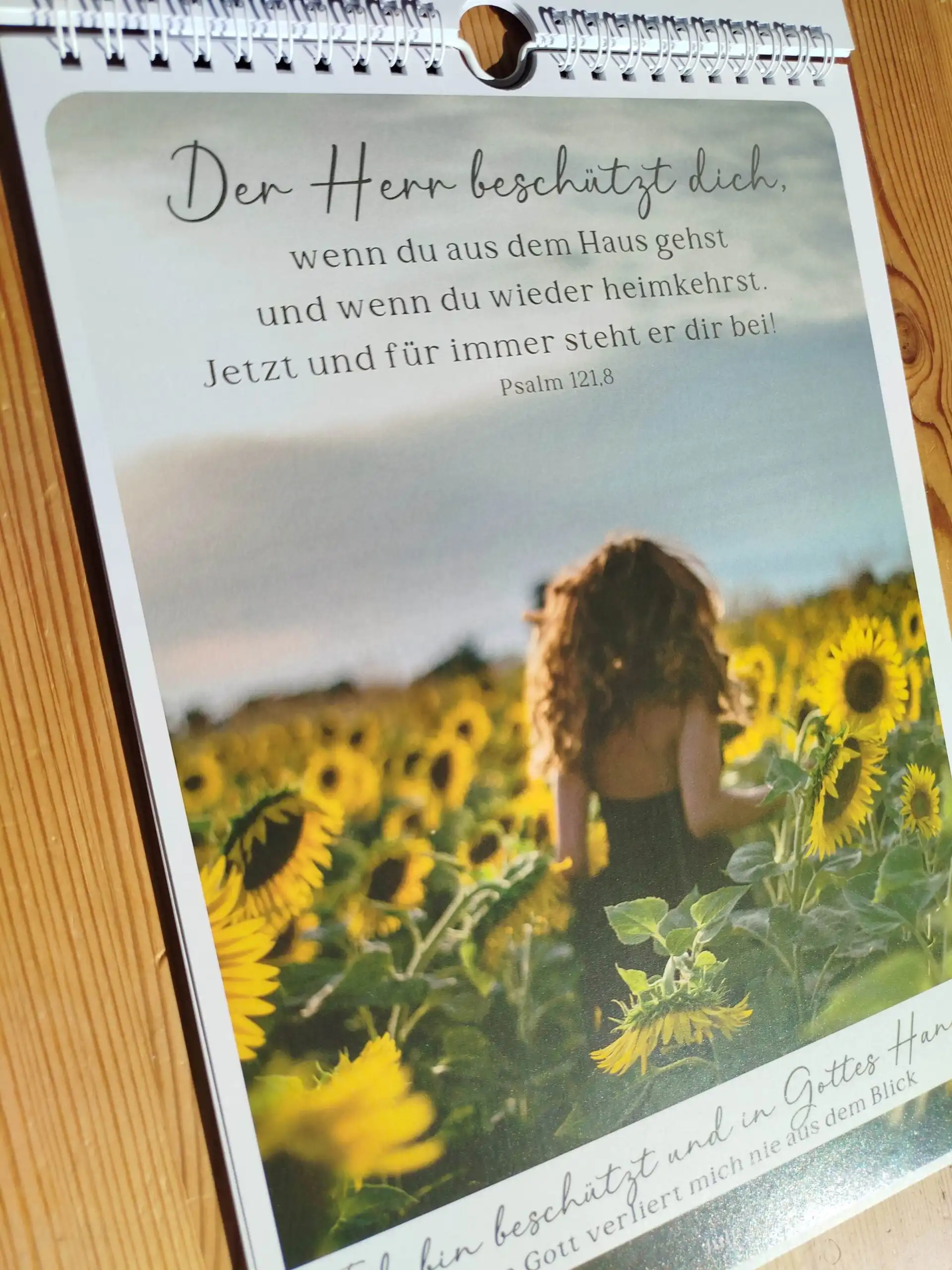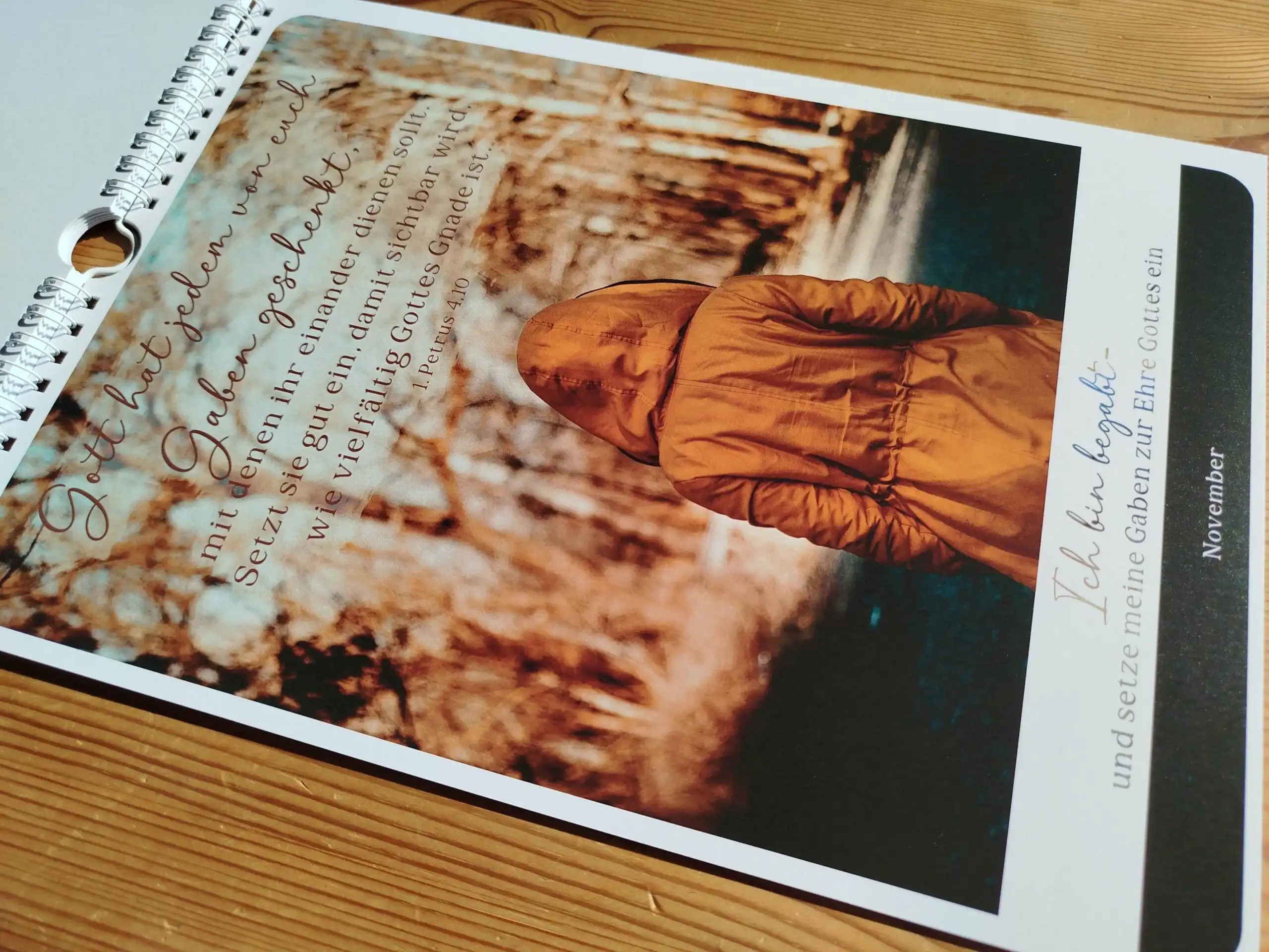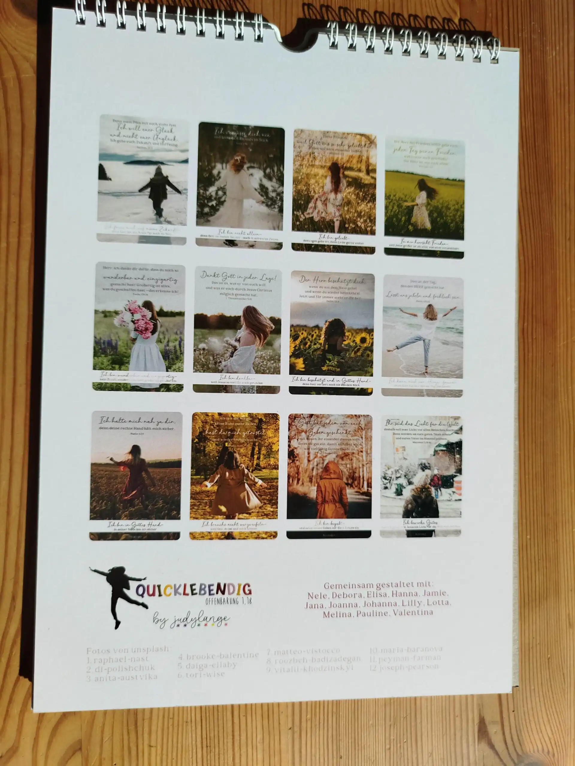 (Beispiel April: Bibelvers: Der Herr des Friedens gebe euch selbst jeden Tag seinen Frieden, was immer auch geschieht! Der Herr sei mit euch allen – Philipper 4,7. Ermutigung: In mir herrscht Frieden, weil Jesus größer ist als alles, was mich verunsichert)