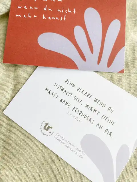 Dieselben Aussagen – anderes Design. Jung, frech und farbenfroh ist dieses Kartenset, bestehend aus 6 verschiedenen Motiven, begleiten Dich mit ermutigenden Aussagen in Deinem Alltag. Auf der Rückseite ist jeweils der passende Bibelvers dazu abgedruckt. Alle 6 Kärtchen, auf 400 g Recyclingpapier gedruckt und im Format DIN A7, passen in den dazugehörigen Kartenhalter aus Eichenholz. So kannst Du immer das Kärtchen nach vorne holen, das Du gerade brauchst. Der Kartenhalter ist handgefertigt und mit Bienenwachs behandelt. Sie eignen sich auch hervorragend zum verschenken oder verteilen im Gottesdienst oder Hauskreis. Du erhältst sie auch in einer Mehrfachpackung mit 24 oder 48 Kärtchen (in diesem Fall ohne Kartenhalter)