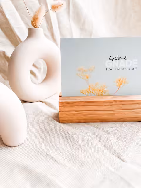 Dieses Kartenset, bestehend aus 6 verschiedenen Motiven, begleiten Dich mit ermutigenden Aussagen in Deinem Alltag. Auf der Rückseite ist jeweils der passende Bibelvers dazu abgedruckt. Alle 6 Kärtchen, auf 400 g Recyclingpapier gedruckt und im Format DIN A7, passen in den dazugehörigen Kartenhalter aus Eichenholz. So kannst Du immer das Kärtchen nach vorne holen, das Du gerade brauchst. Der Kartenhalter ist handgefertigt und mit Bienenwachs behandelt. Sie eignen sich auch hervorragend zum verschenken oder verteilen im Gottesdienst oder Hauskreis.
