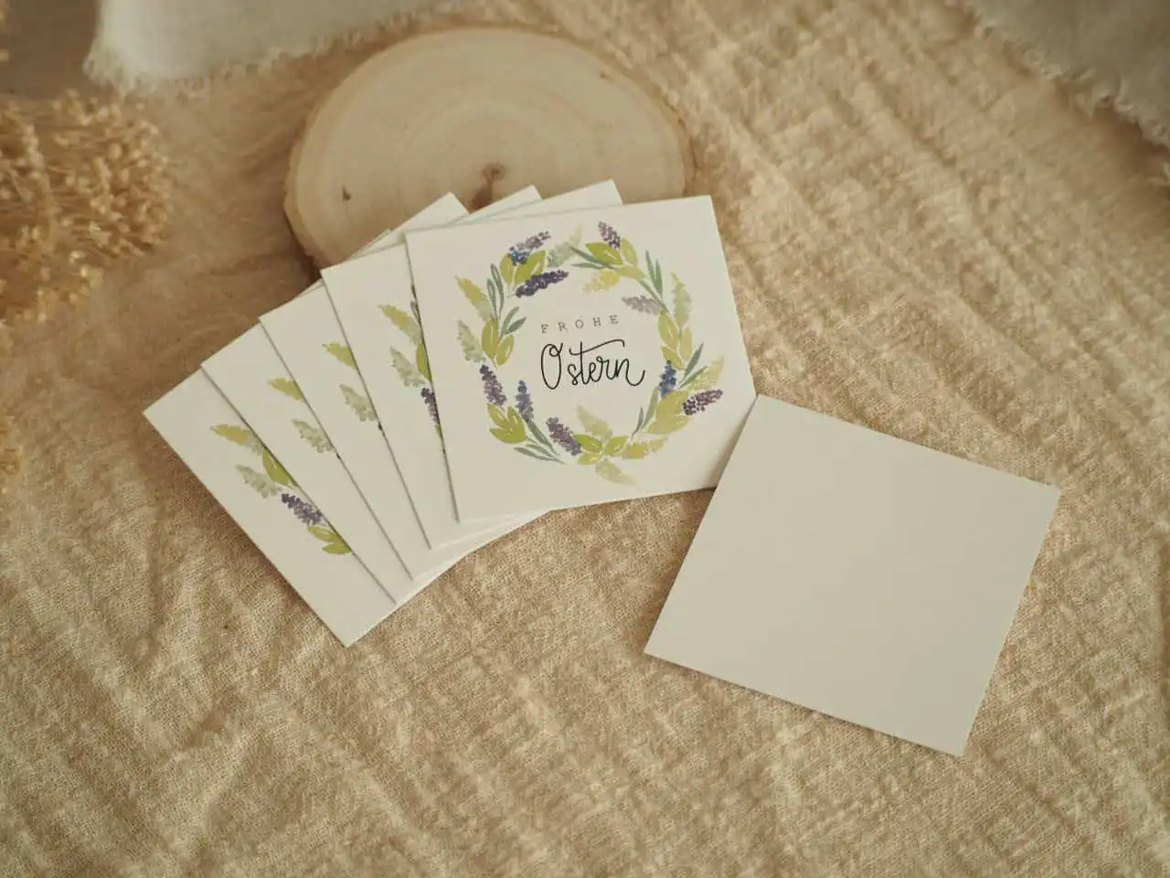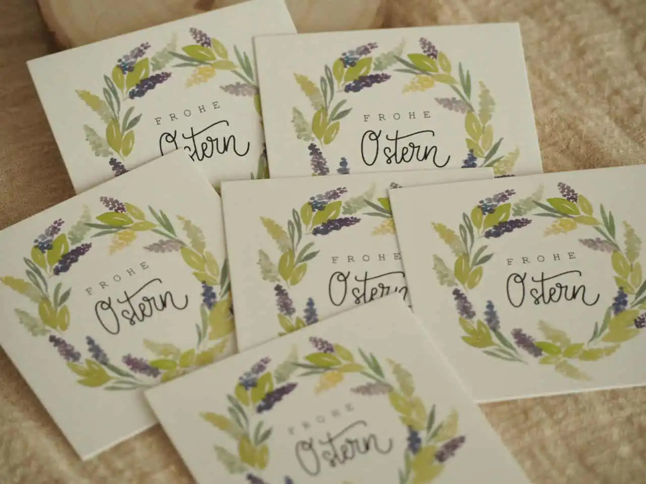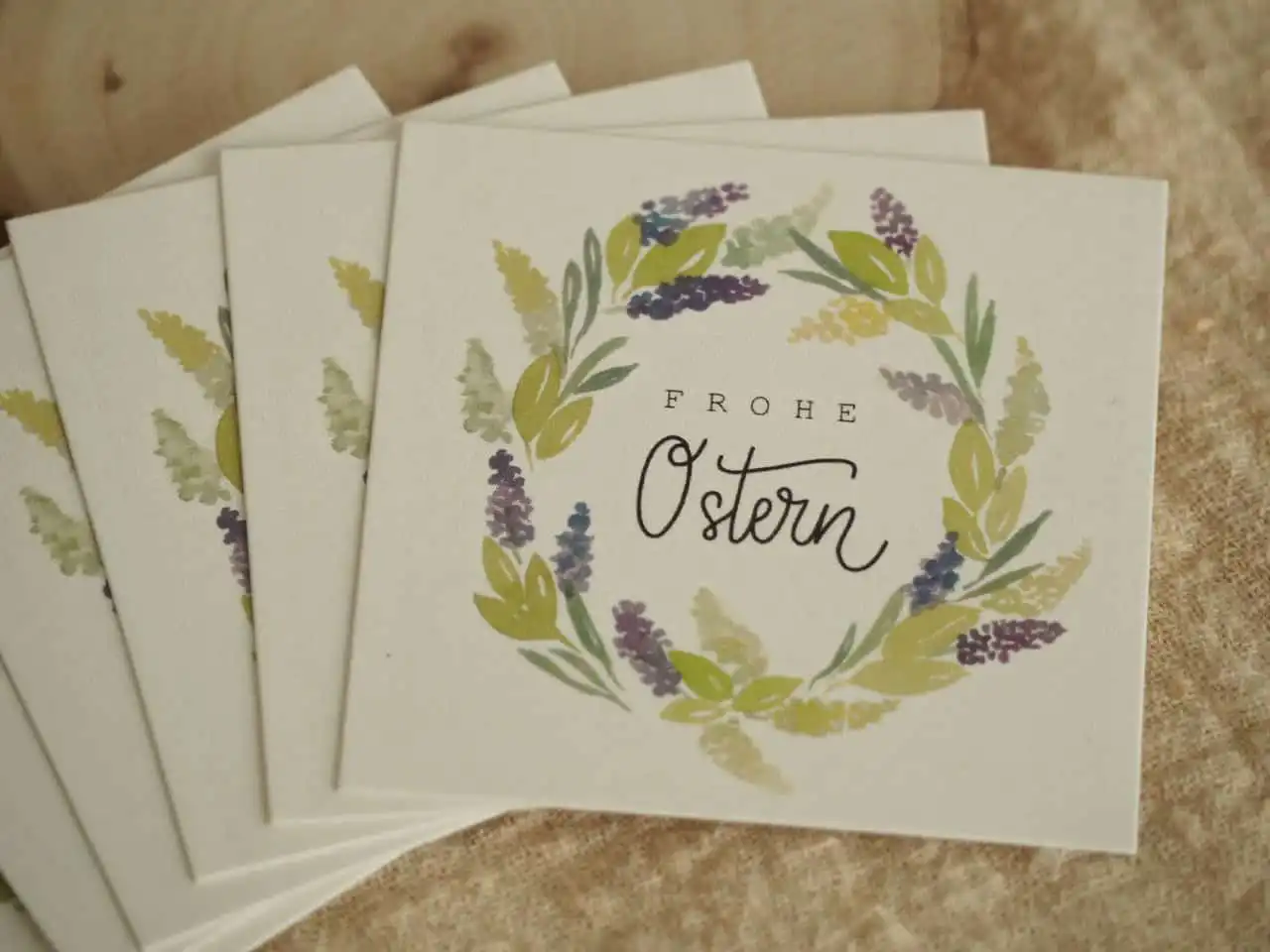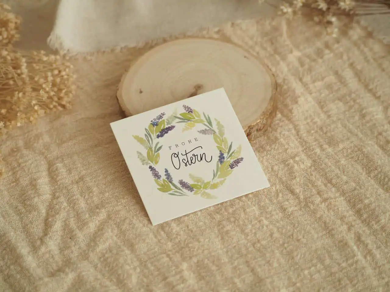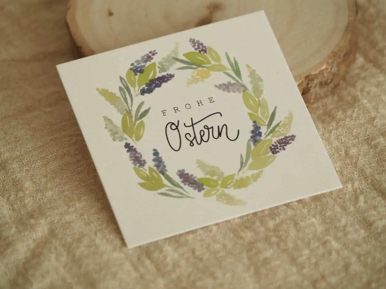 Der Osterkranz ist mit Aquarellfarben gemalt, digitalisiert und in Farbe gedruckt.