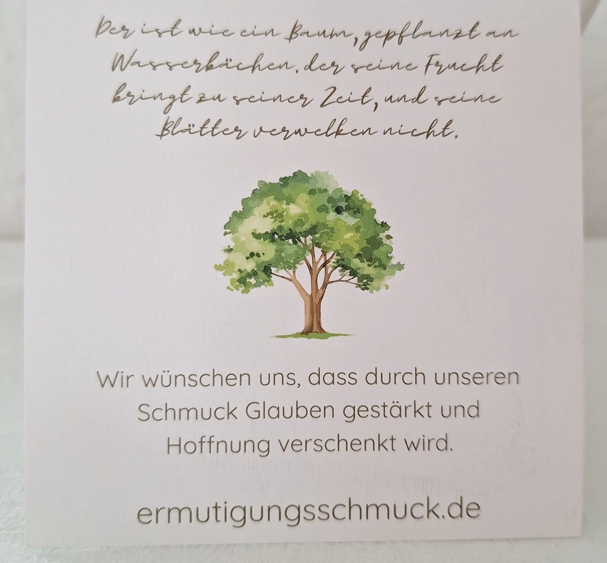 Die Baum-Kette in Gold steht für Leben, Stärke und Beständigkeit. Sie trägt den Vers aus Psalm 1,3: „Der ist wie ein Baum, gepflanzt an Wasserbächen.“ – ein Bild für tiefe Wurzeln und lebendige Hoffnung.