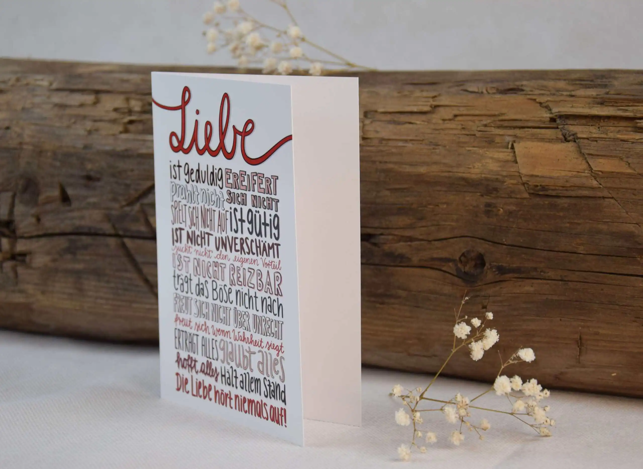 Die Glückwunschkarte “Liebe” ist passend zur Hochzeit oder zur Verlobung. Frei nach der Bibelstelle 1. Korinther 13 wurde die Karte gestaltet und zählt somit die Bestandteile der Liebe auf.