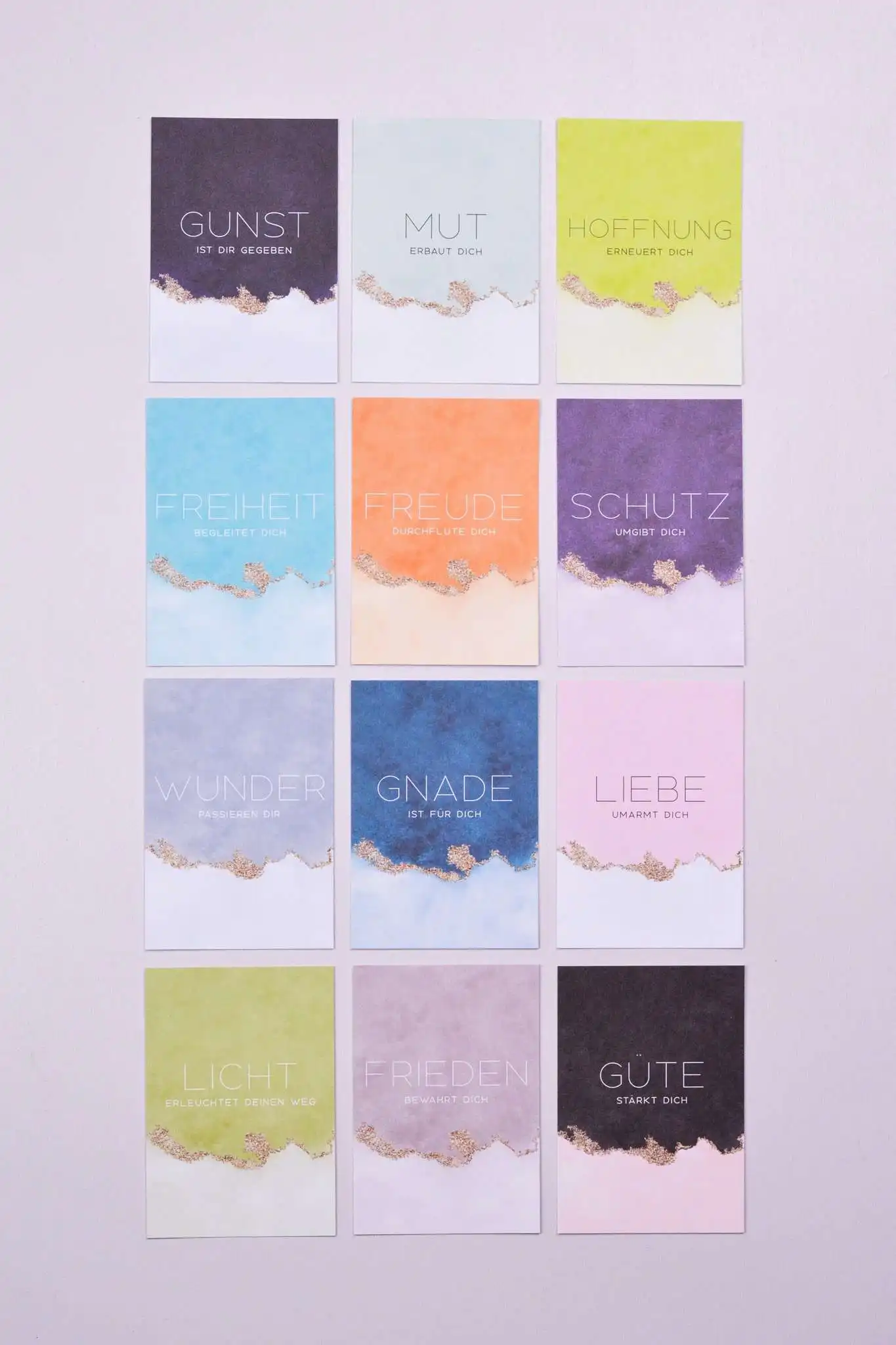 - 12 Motive (Mut, Freude, Güte, Schutz, Wunder, Gunst, Licht, Freiheit, Liebe, Gnade, Frieden, Hoffnung)