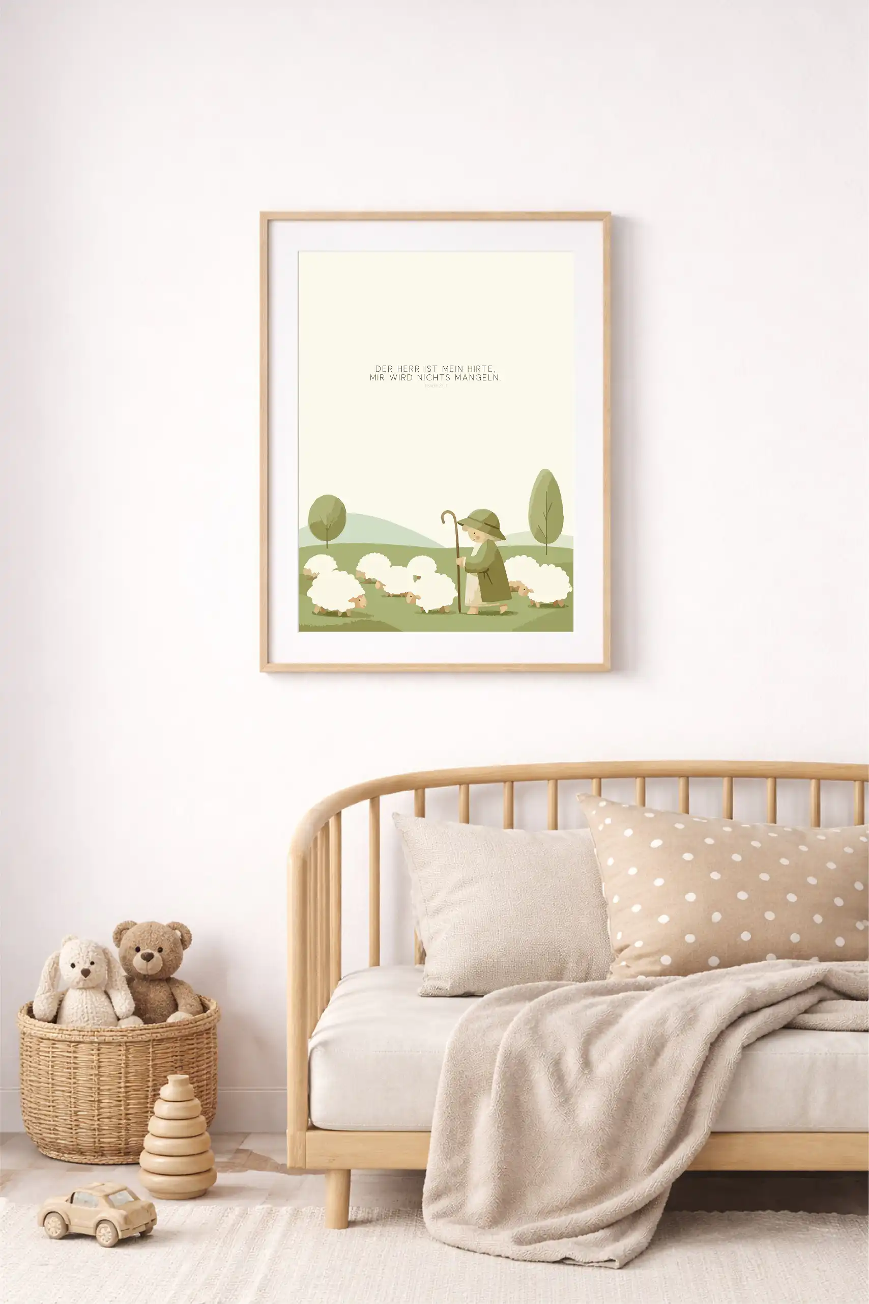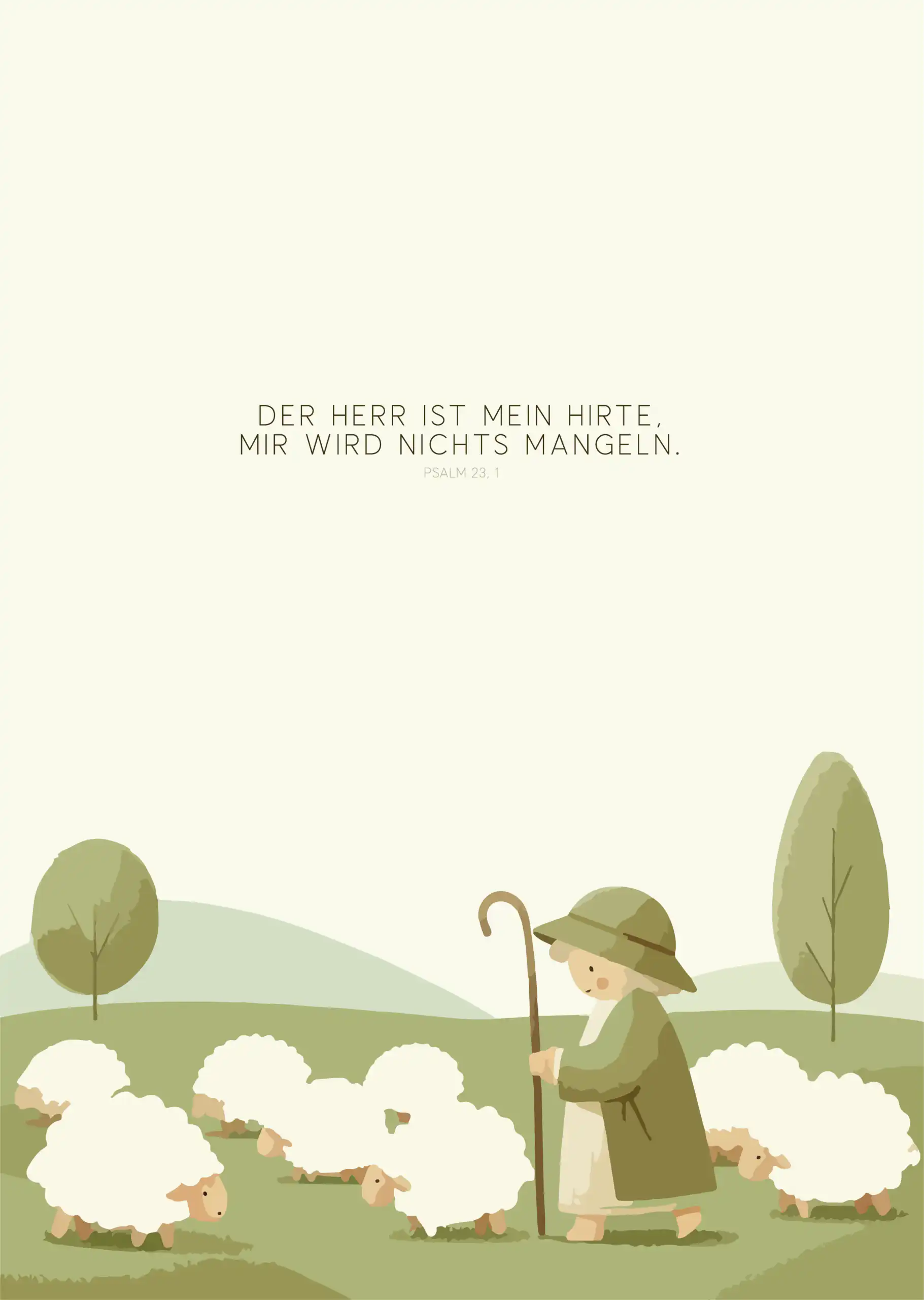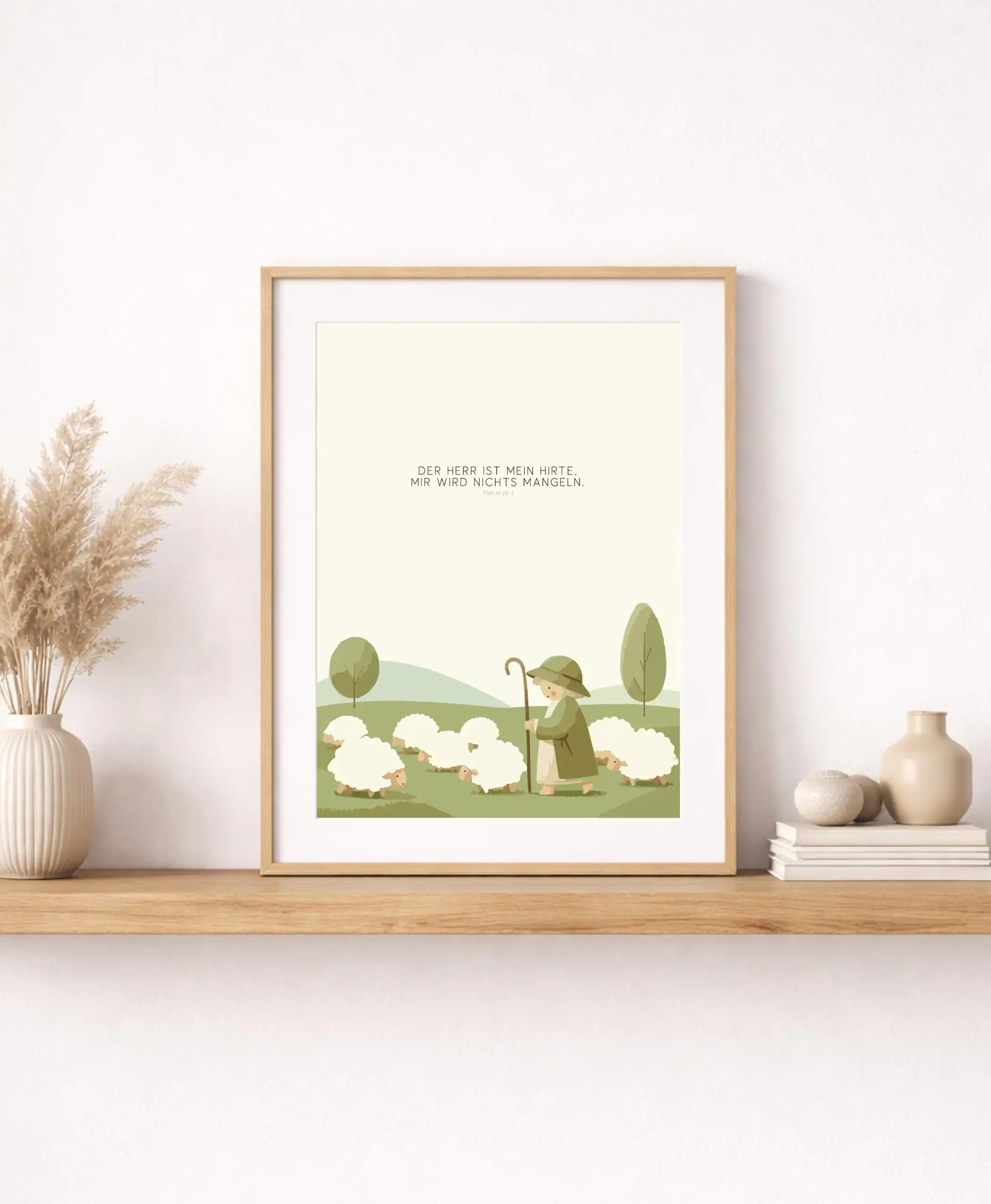 Bringe Wärme, Geborgenheit und eine liebevolle Botschaft ins Kinderzimmer mit diesem wunderschönen Poster mit der Aufschrift „Der Herr ist mein Hirte, mir wird nichts mangeln.“ (Psalm 23,1). Dieser Bibelvers erinnert Kinder jeden Tag daran, dass sie behütet und begleitet sind.