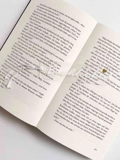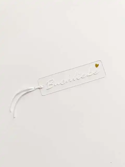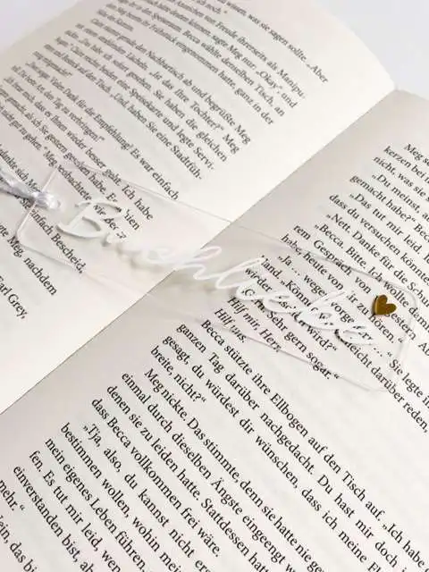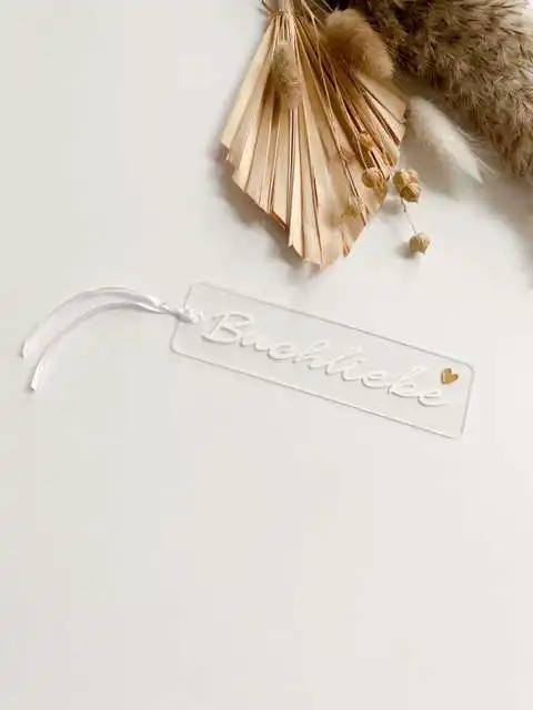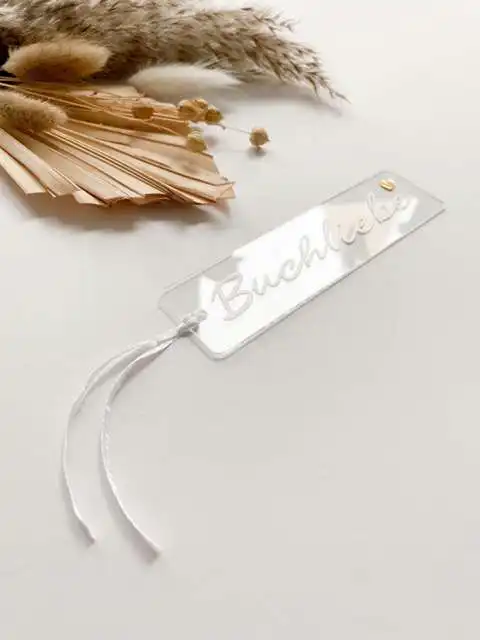 Das Lesezeichen besteht aus Acrylglas. Ein weißes Satinband ist in der Lieferung mit enthalten.