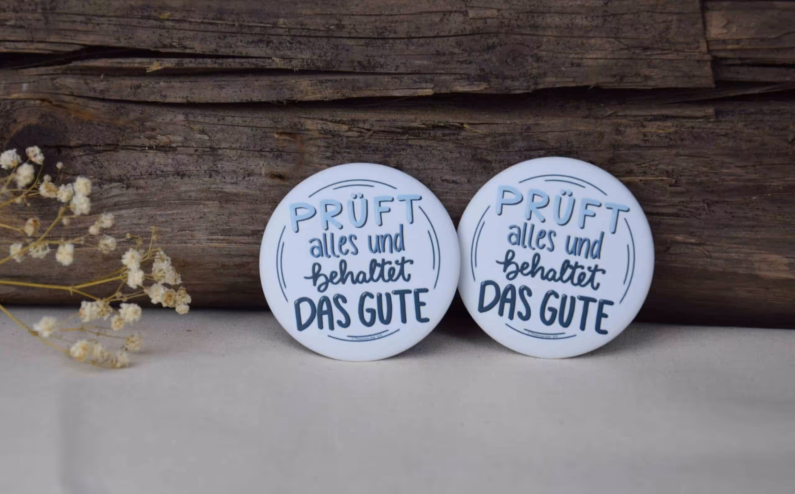 Mit dem Bibelvers der Jahreslosung 2025 ist der Magnet stilvoll und schlicht gestaltet. Die Bibelstelle aus 1. Thessalonicher 5,21 “Prüft alles und behaltet das Gute” soll Dich im neuen Jahr begleiten.