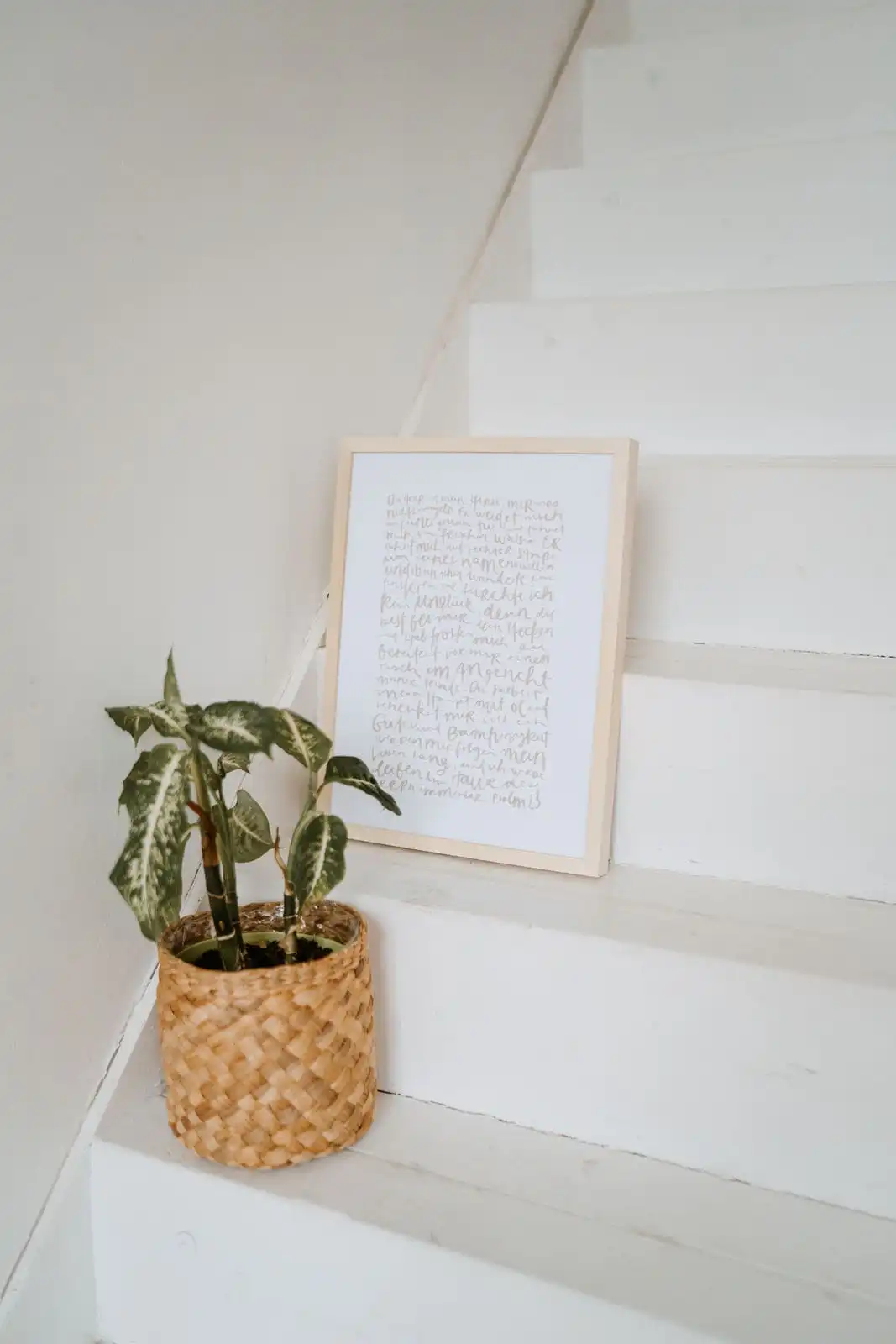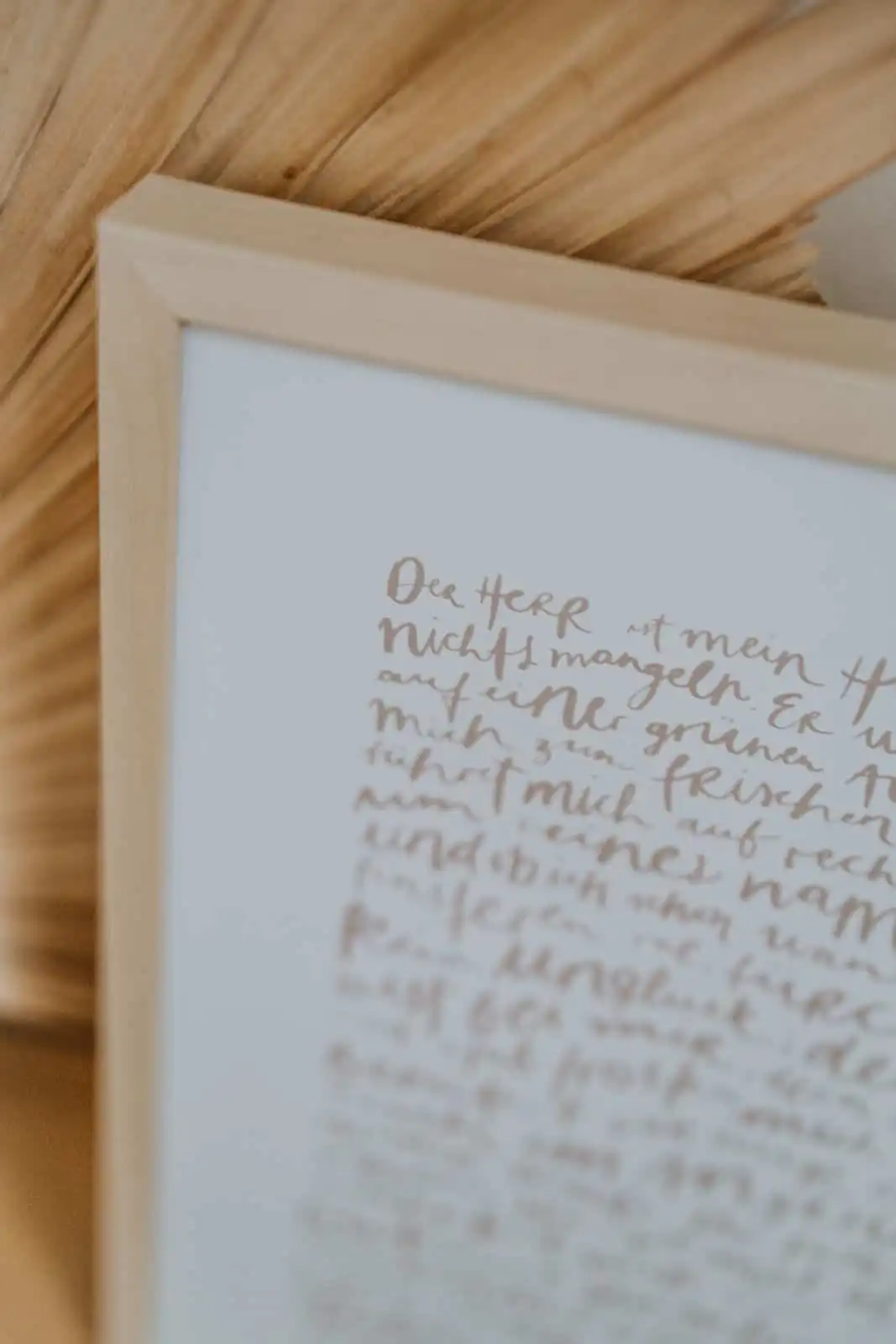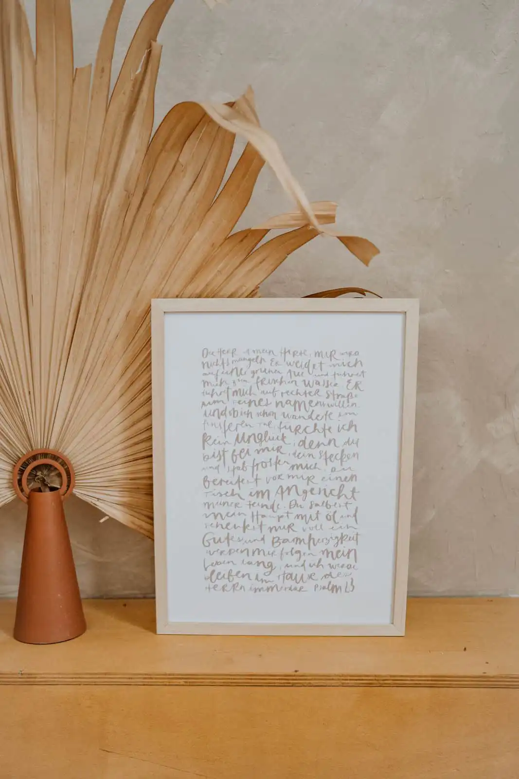 Die Schrift hat eine helle Farbe (beige / grau-beige / greige). Besonders schön macht sich das Poster in einem holz-farbenen Bilderrahmen oder Bilderleiste.