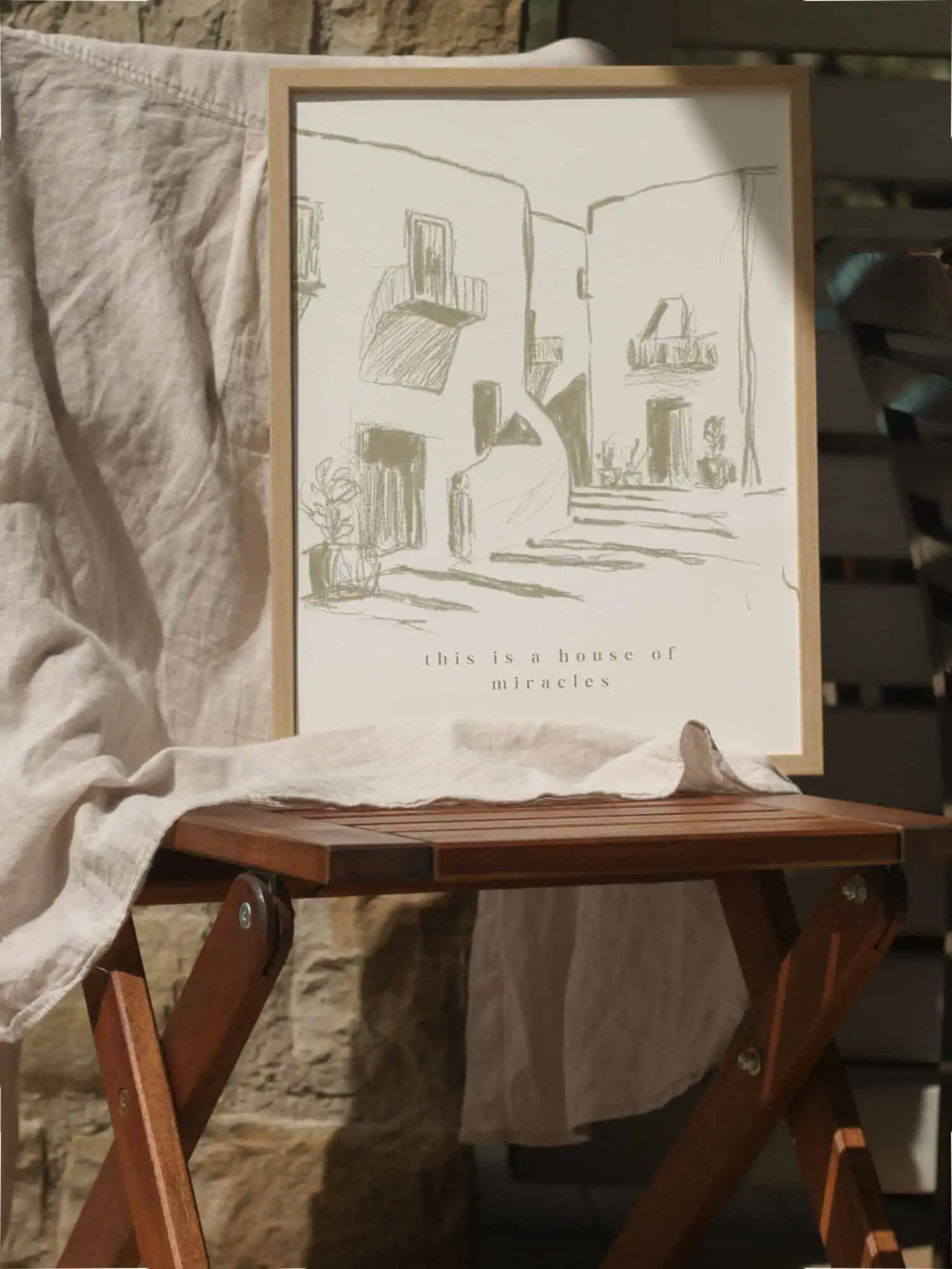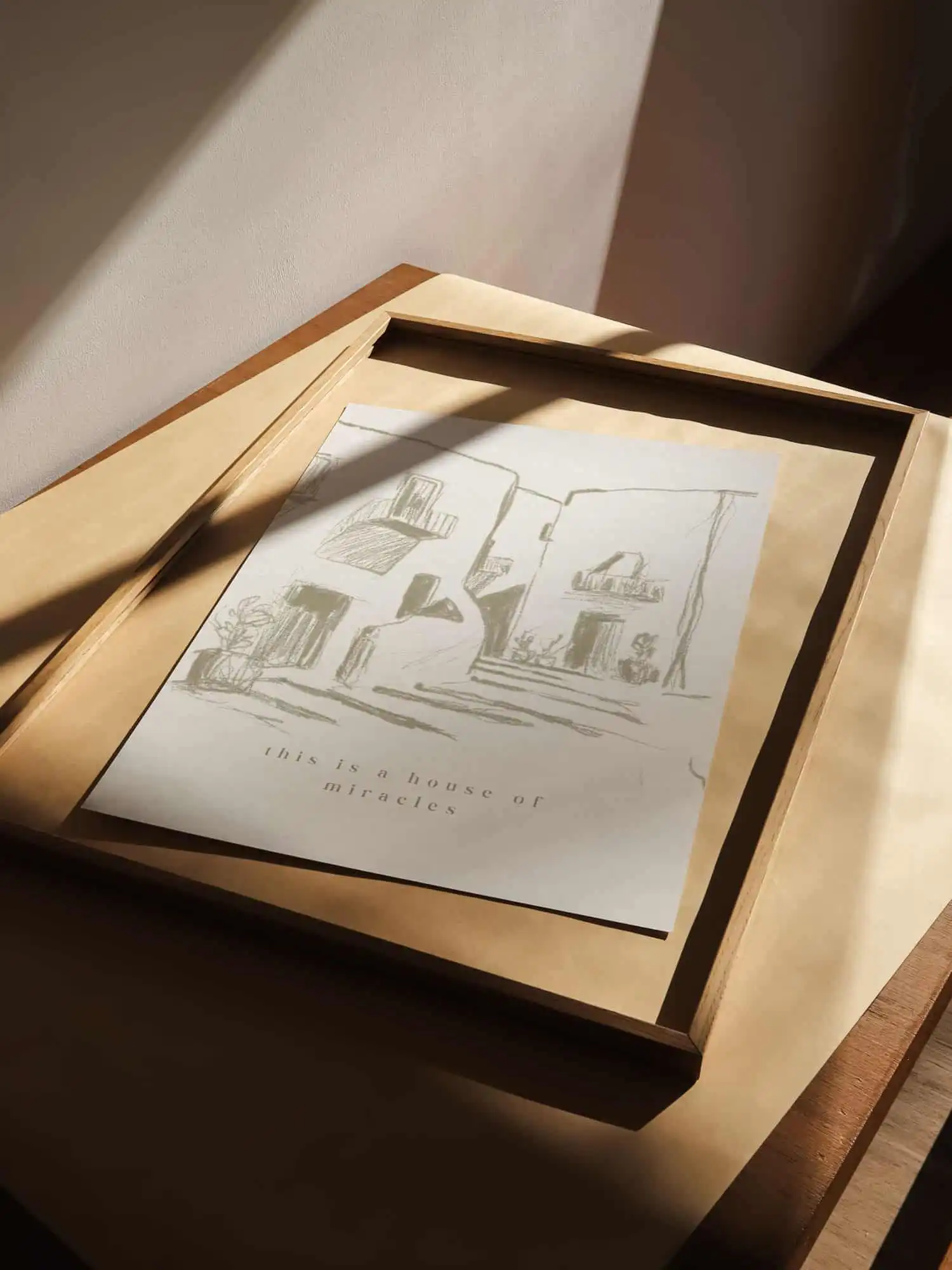 Ästhetisches christliches Poster “This is a house of miracles” in Beige und Creme – minimalistische Wanddeko, ideal als Geschenk zum Einzug oder fürs Wohnzimmer.