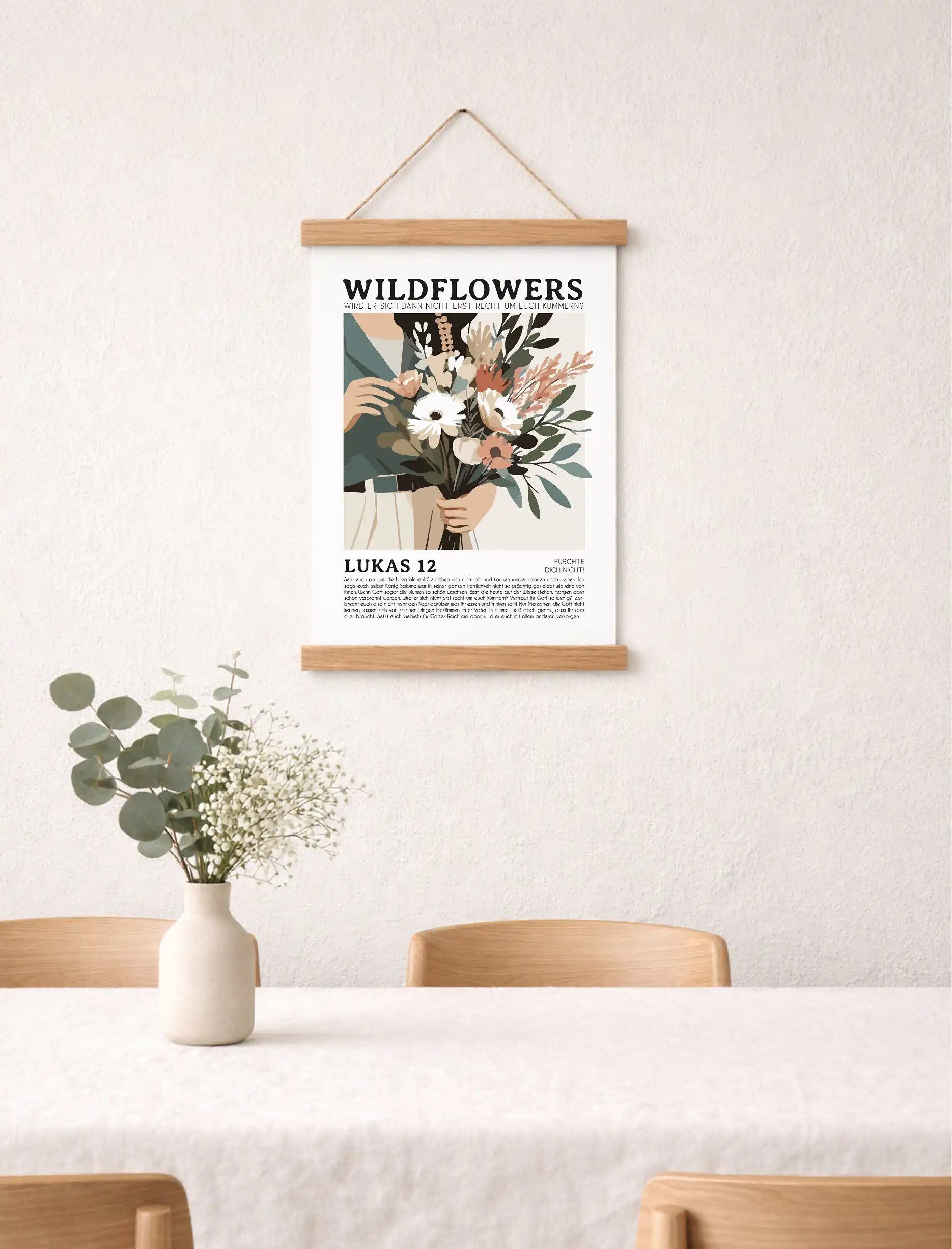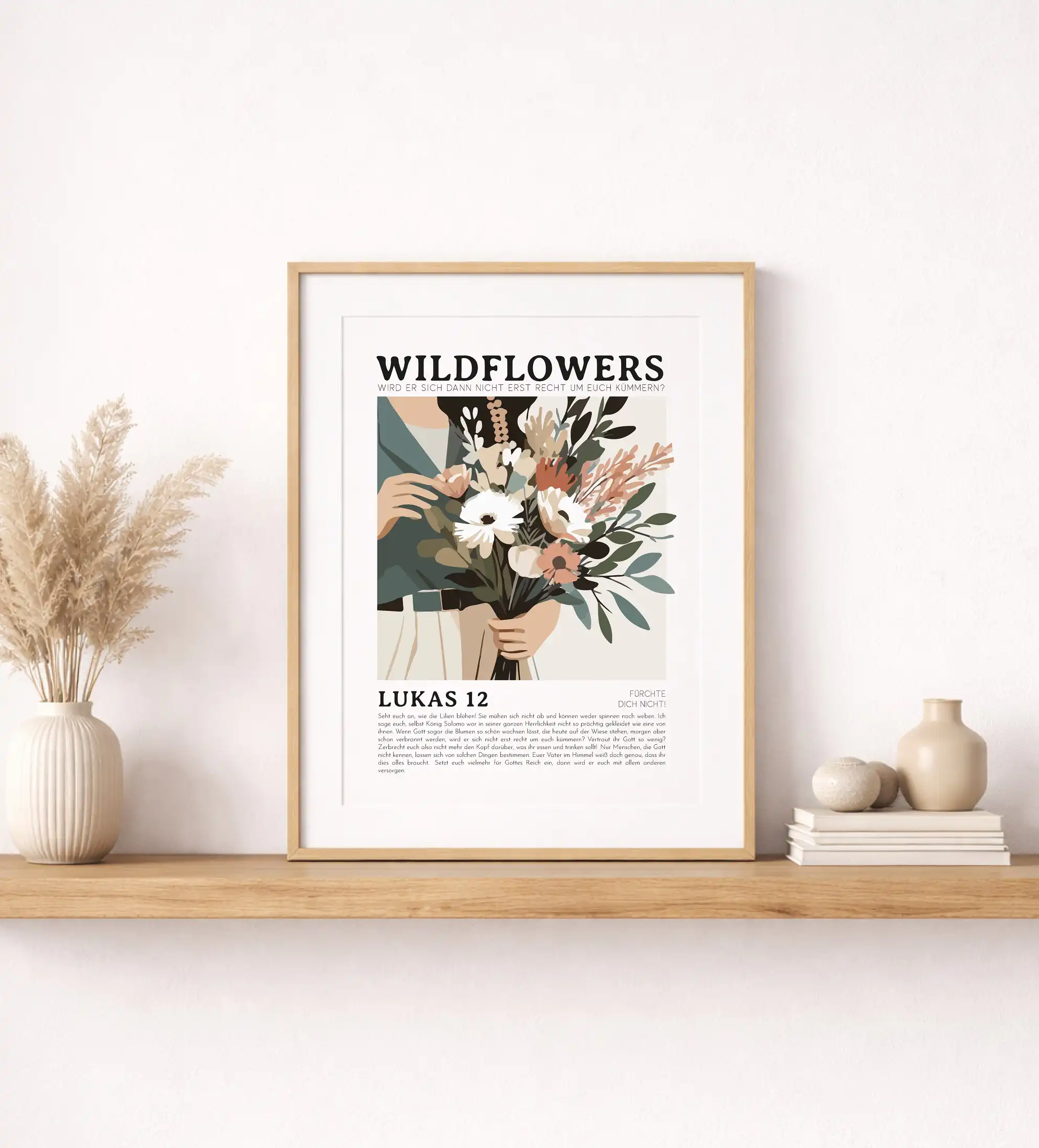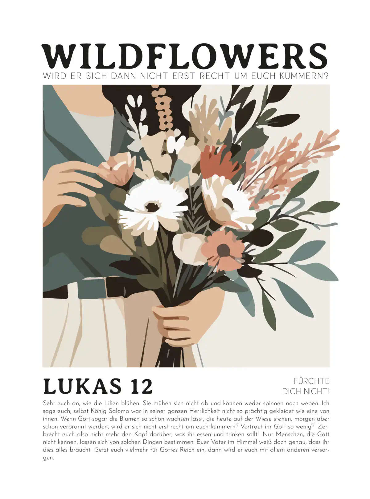 Dieses liebevoll gestaltete Poster mit einem Bibelvers aus Lukas 12 erinnert daran, wie wertvoll und wunderbar Gottes Schöpfung ist. In diesem Abschnitt lädt Jesus Christus dazu ein, die Schönheit der Blumen zu betrachten – sie wachsen und blühen in beeindruckender Pracht, ohne sich Sorgen zu machen. Damit wird deutlich: Wenn Gott sich so liebevoll um die Blumen kümmert, sorgt er erst recht für uns.