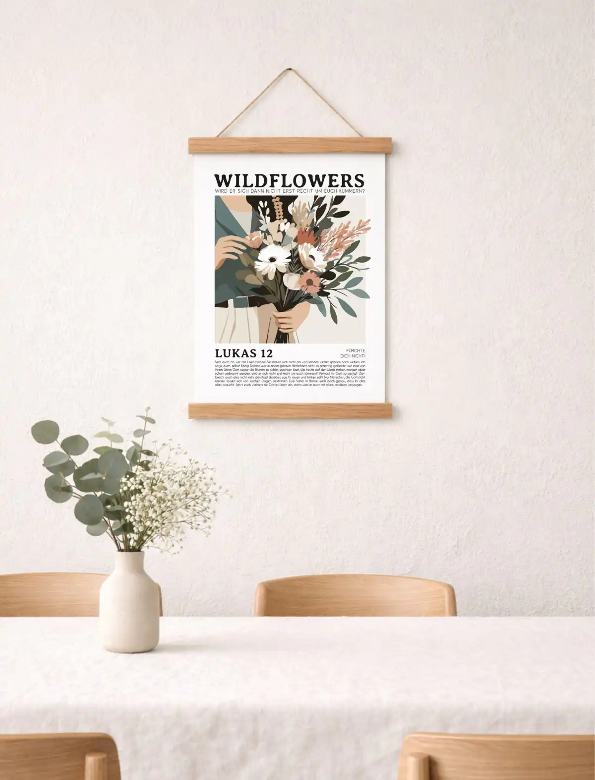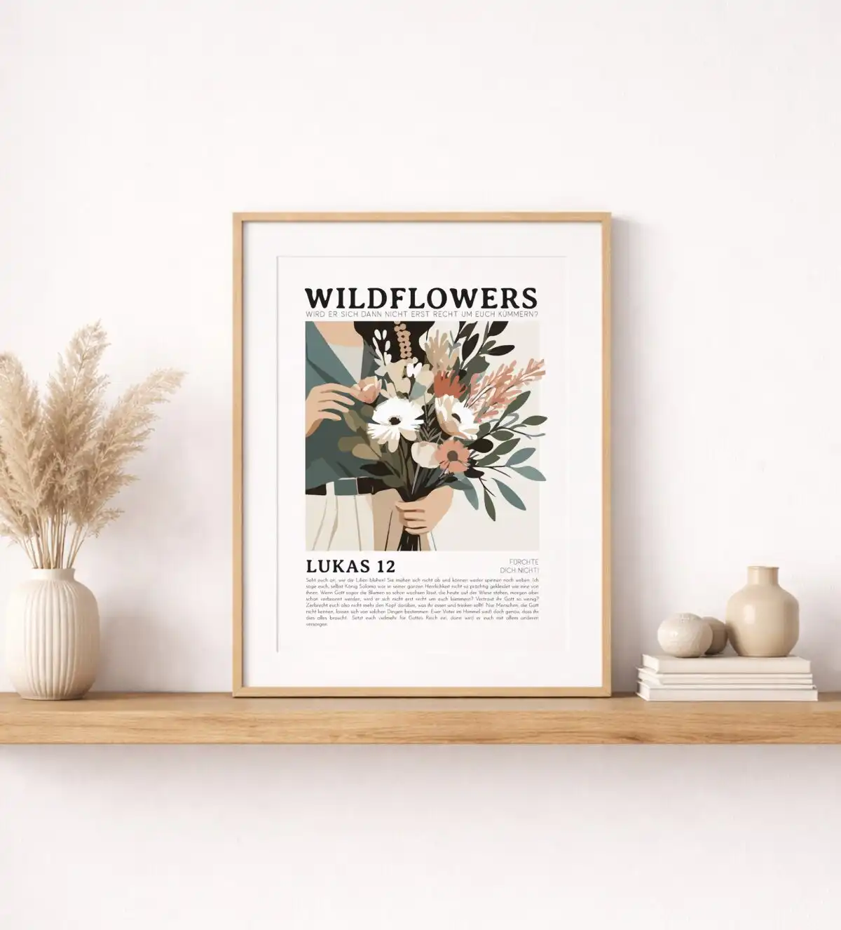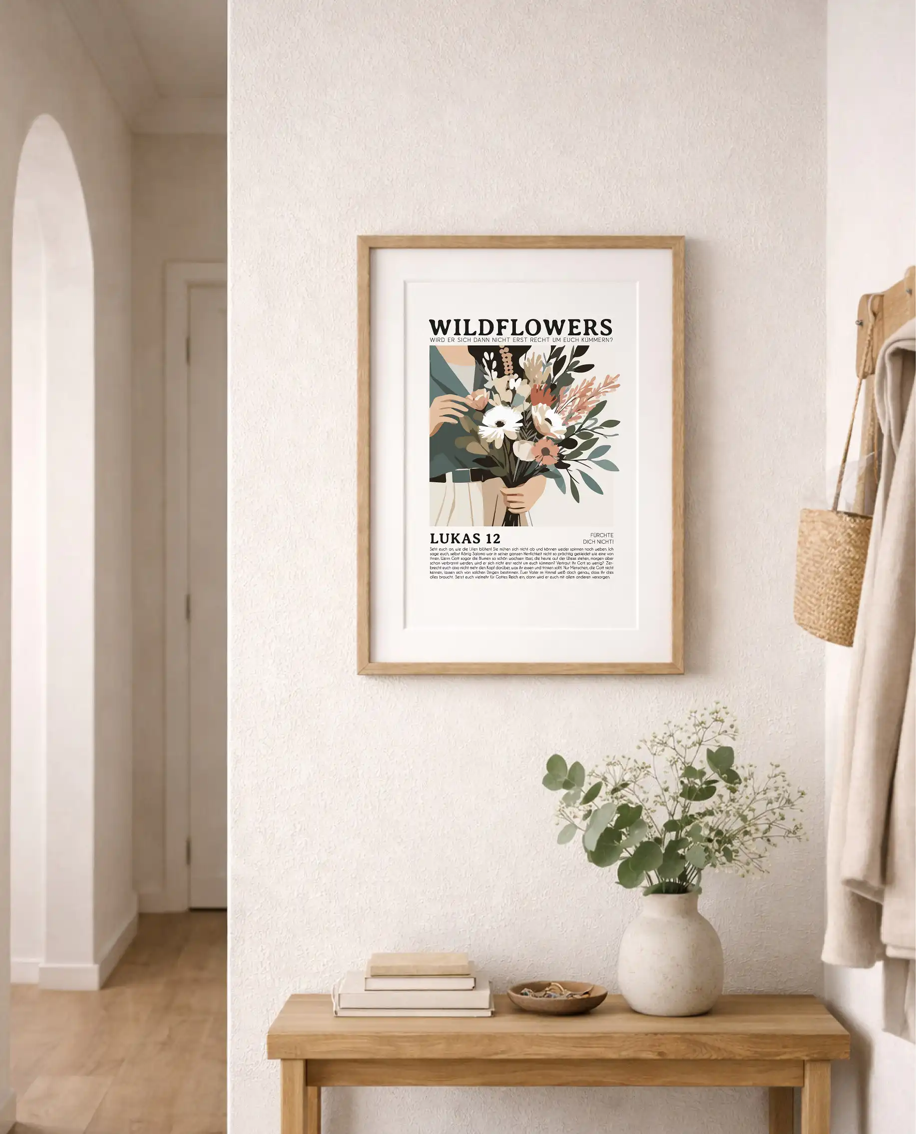 Der ausgewählte Vers verbindet eine beruhigende Botschaft mit der Schönheit der Natur. Das Poster erinnert daran, Vertrauen zu haben, loszulassen und die kleinen Wunder des Lebens wahrzunehmen.