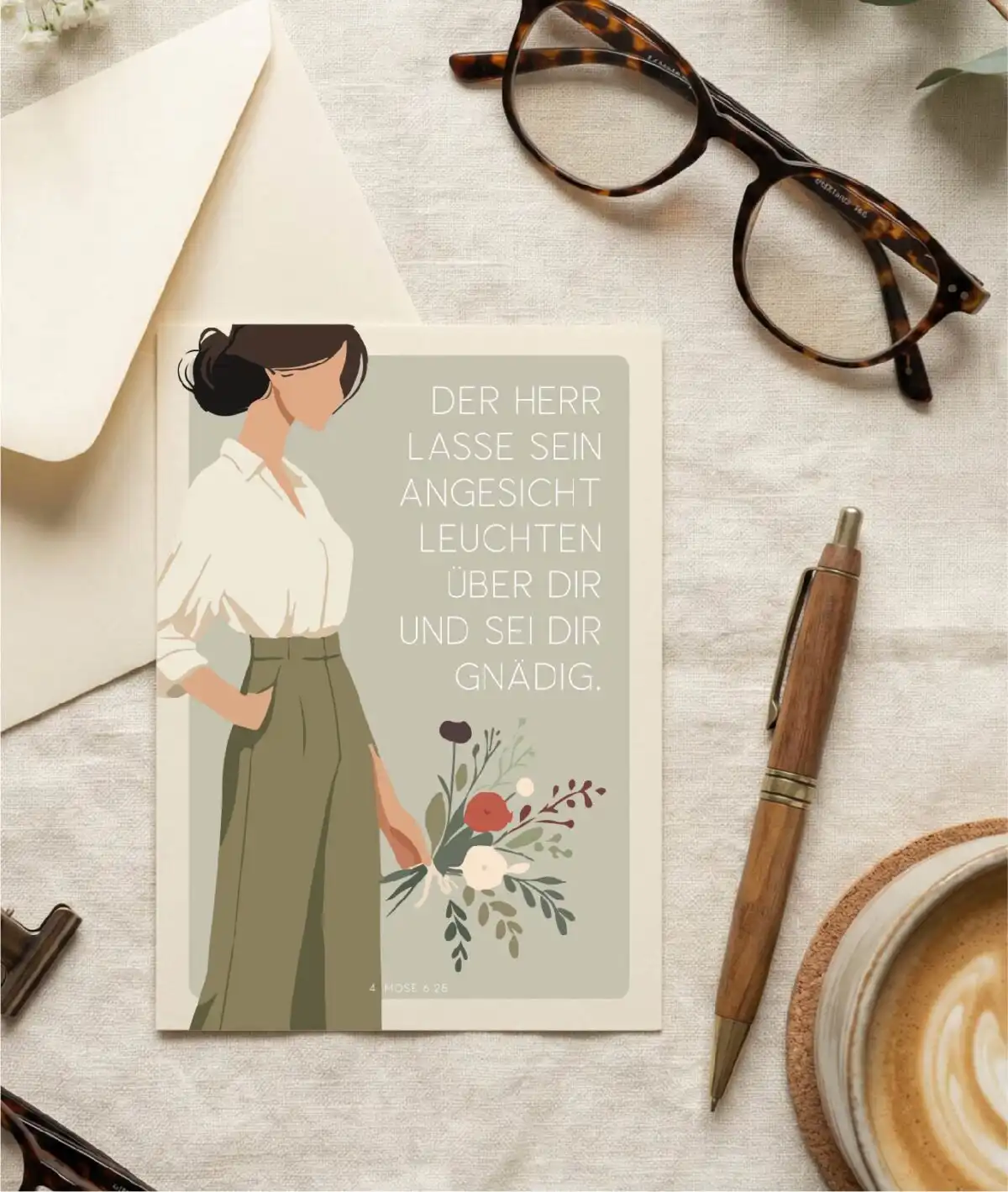 Dieses liebevoll gestaltete Postkarten-Set verbindet zeitlose Worte des Segens mit einem stilvollen Design. Die drei Karten greifen jeweils einen Teil des bekannten biblischen Segens aus 4. Mose 6,24–26 auf und laden dazu ein, Hoffnung, Schutz und Frieden weiterzugeben.