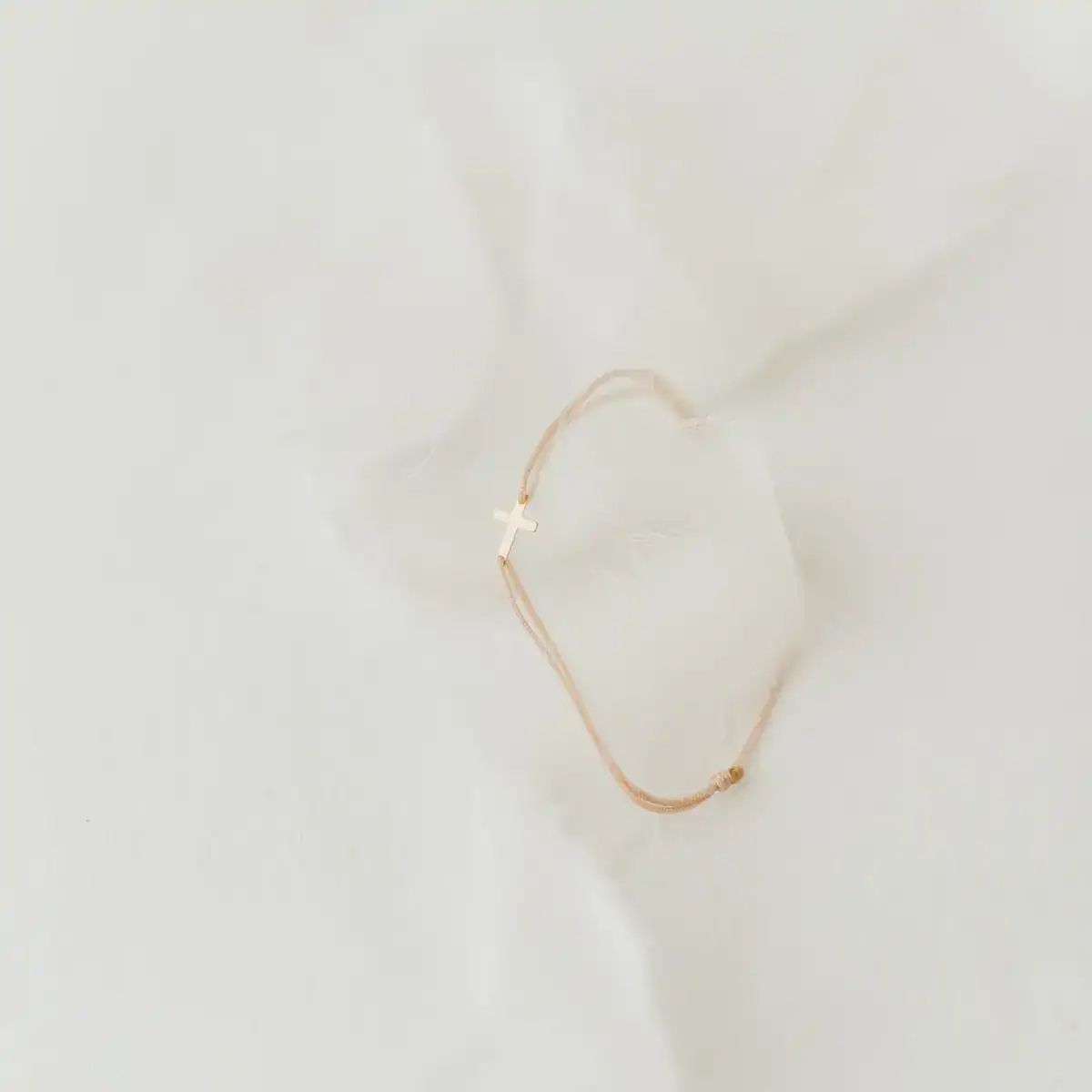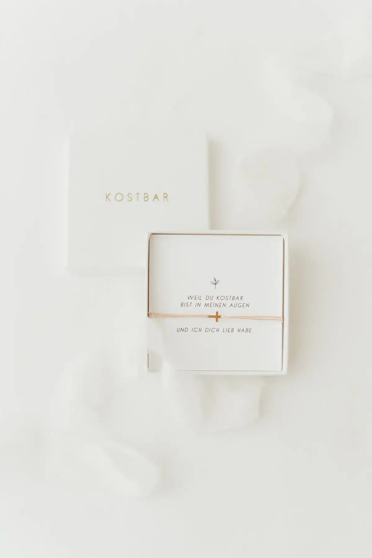 Ihr erhaltet ein zartes Armband mit einem goldenen oder silbernen Kreuz inkl. Schmuckschachtel mit Goldprägung KOSTBAR auf einer kleinen Karte mit Spruch.
