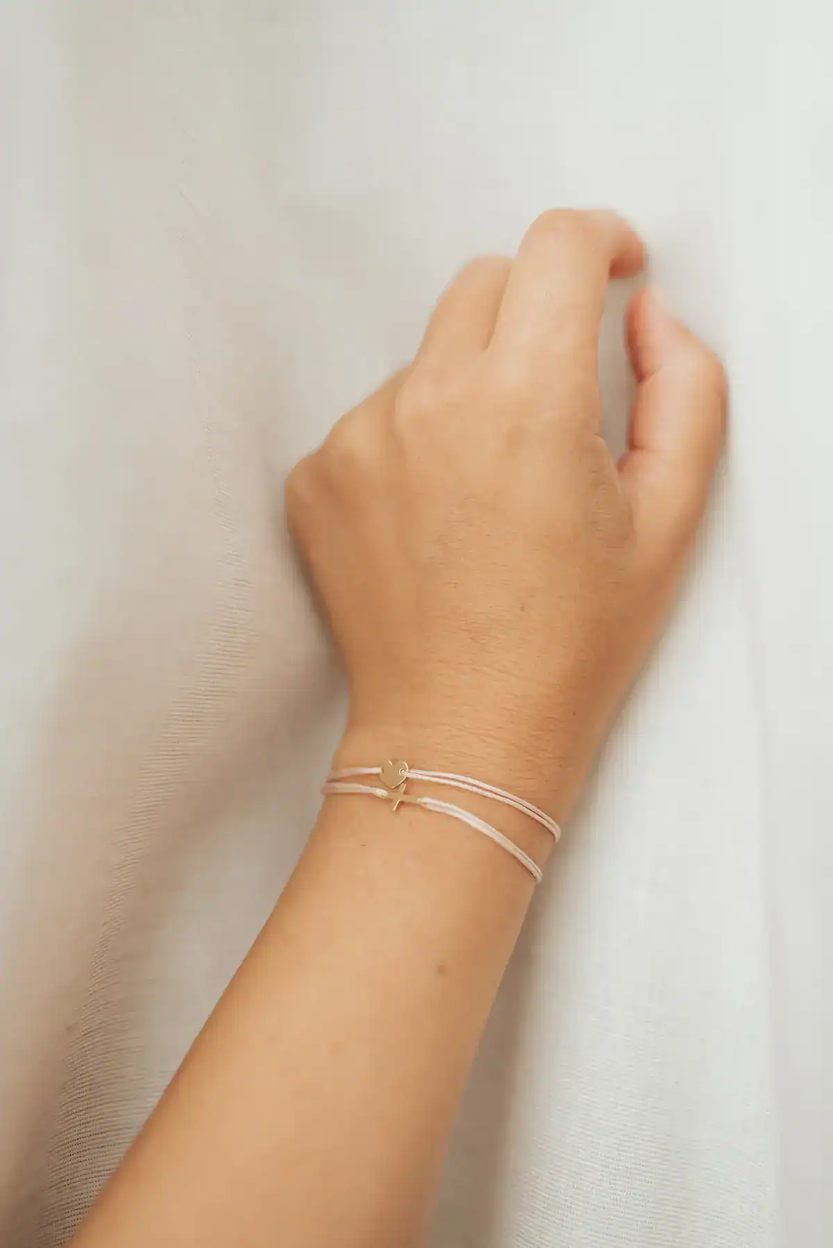 Details: Die Metallelemente sind aus 925er Sterling Silber (bei gold: mit einer 18 Karat Vergoldung.) Sie sind für Allergiker geeignet und Nickelfrei. Das cremefarbene Band ist aus Nylon, farbecht und reiß- und Wasserfest.